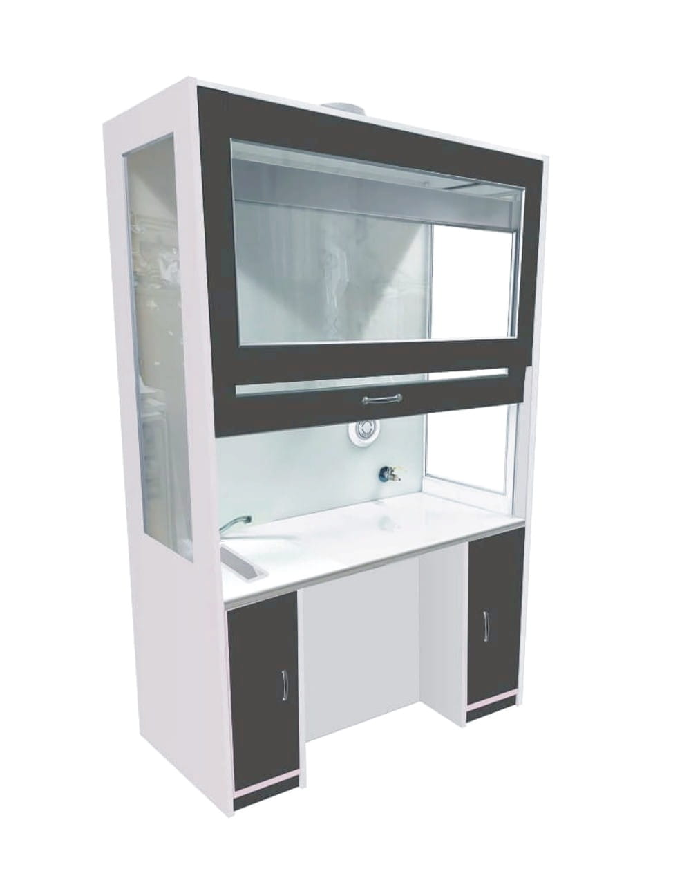 -górnej: komory manipulacyjnej oszklonej szybami hartowanymi, wyłożonej płytą polipropylenową odporną na kwasy i zasady do wysokości sufitu. Komora wyposażona jest w zlew polipropylenowy, baterie, zawór gazowy, anemostat nawiewny. Blat wykonany z ceramiki litej technicznej.