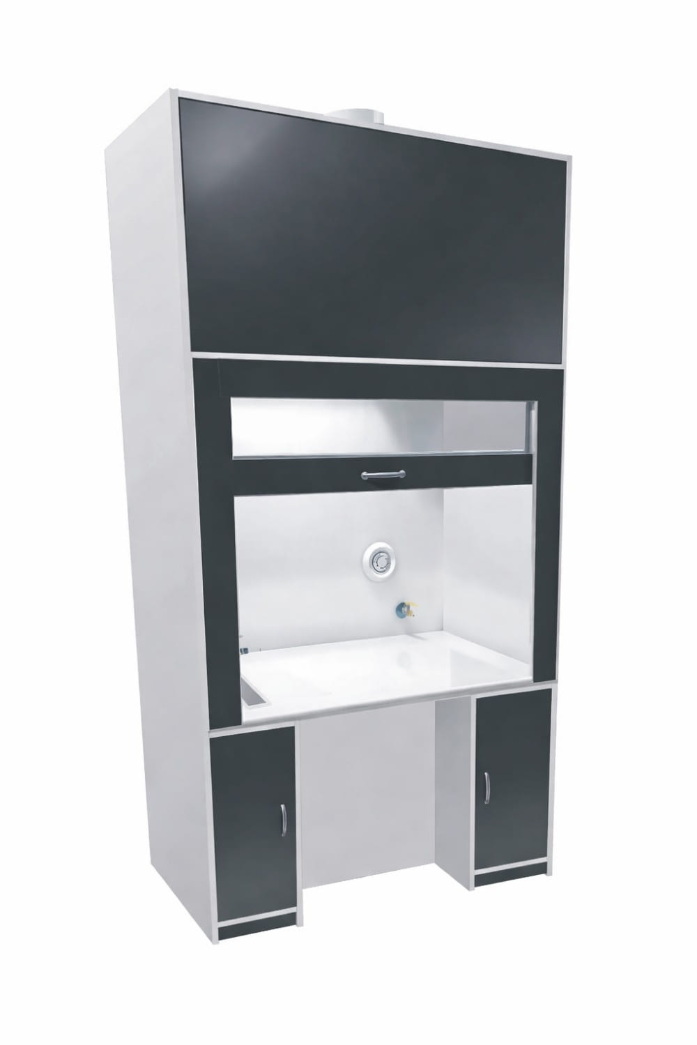 W komorze zamocowana jest przesuwana okiennica podnoszona za pomocą systemu „Fennel”. Pozwala on na ustawienie okiennicy (góra-dół) w dowolnym położeniu. Dygestorium w standardzie posiada wentylację wywiewną sufitową. Wentylator z płytą montażową stanowi wyodrębnioną część wyciągu do montażu na otworze kominowym. W standardzie wentylator kanałowy dwubiegowy o mocy 350-500m3//h dwubiegowy. Króciec wylotowy wentylacji fi 150mm. Instalacja wyciągowa wykonana jest z polistyrenu w wersji podstawowej. Całość na nośniku laminatu 18 mm. Grubość ścian blatu i komory roboczej 25mm. Regulowane nóżki umożliwiają wypoziomowanie dygestorium. W dygestorium modern przody wykonane są w zmienionym kolorze, w standardzie grafitowy. Inne kolory możliwe do wykonania na specjalne zamówienie. Dodatkowo dygestorium komfort posiada miejsce na nogi, co umożliwia wygodną pracę przy dygestorium w pozycji siedzącej. Kolor bazowy dostępny w dwóch wersjach: biały, popiel.