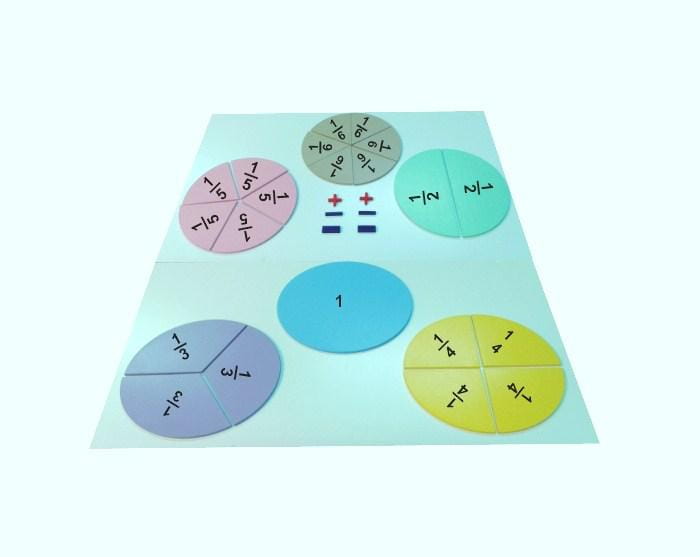 Zestaw kół wykonanych ze sklejki 8 mm, o średnicy 40 cm, podzielonych odpowiednio na 2, 3, 4, 5, 6 części oraz jedno całe koło. Każde koło w innym kolorze. Zestaw zawiera dodatkowo znaki +, -, = (po dwie sztuki). Wszystkie elementy zestawu wyposażone są w magnesy. Wszystkie elementy kół posiadają oznaczenia