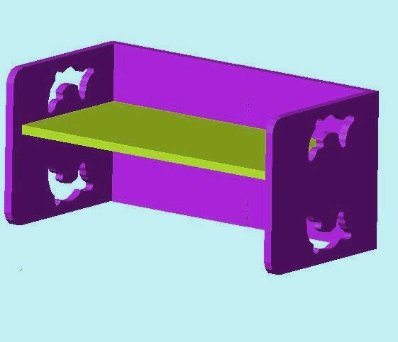 Ławka przedszkolna wykonane z płyty mdf 18 mm, malowane w kolorze pastelowym, lub wykonane ze sklejki 18 mm w kolorze drewnopodobnym. Może być wykonane w jednym lub dwóch wersjach kolorystycznych. Ławka posiada dwie wysokości siedziska, 25 i 35 cm, dzieci, oraz dzieci mających powyżej 3 lat. Wszystkie krawędzie krzesła są zaokrąglone. Może wielofunkcyjne, służyć po obróceniu również jako stolik, lub regał. Wycięte delfiny służące jako rączki, dodatkowo uatrakcyjniają wygląd ławki. Ławka jest składana za pomocą klucza imbusowego, który dołaczamy do produktu.