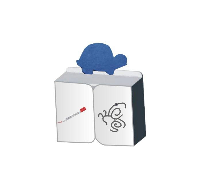 Segmenty wykonany z płyty meblowej 18 mm w kolorze popielatym. Drzwi standardowo w kolorze białym do pisania pisakiem suchościeralnym. Ścianki manipulacyjne umożliwiają ćwiczenie koordynacji ruchowej dzieci. W części środkowej szafka z półką. Szafka zamykana jest na zamek z kluczem. Żółw wykonany z płyty mdf, malowany w pastelowych kolorach, wielkości ok 500 mm uatrakcyjnia wygląd wyrobu. Zaczepy umożliwiają przytwierdzenie wyrobu do ściany.