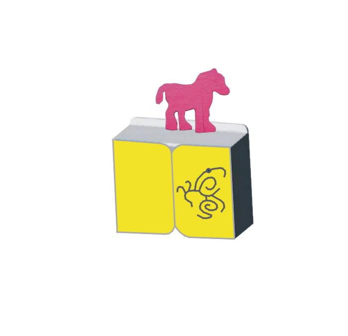 Segmenty wykonany z płyty meblowej 18 mm w kolorze popielatym. Drzwi standardowo w kolorach żółtym lub niebieskim. Ścianki manipulacyjne umożliwiają ćwiczenie koordynacji ruchowej dzieci. W części środkowej szafka z półką. Szafka zamykana jest na zamek z kluczem. Koń wykonany z płyty mdf, malowany w pastelowych kolorach, wielkości ok 500 mm uatrakcyjnia wygląd wyrobu. Zaczepy umożliwiają przytwierdzenie wyrobu do ściany.