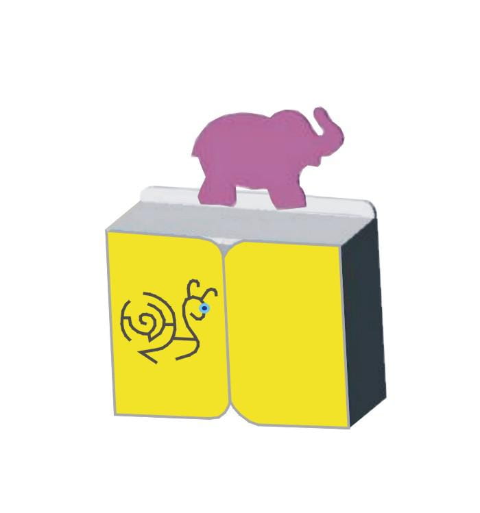 Segmenty wykonany z płyty meblowej 18 mm w kolorze popielatym. Drzwi standardowo w kolorach żółtym lub niebieskim. Ścianki manipulacyjne umożliwiają ćwiczenie koordynacji ruchowej dzieci. W części środkowej szafka z półką. Szafka zamykana jest na zamek z kluczem. Słoń wykonany z płyty mdf, malowany w pastelowych kolorach, wielkości ok 500 mm uatrakcyjnia wygląd wyrobu. Zaczepy umożliwiają przytwierdzenie wyrobu do ściany.