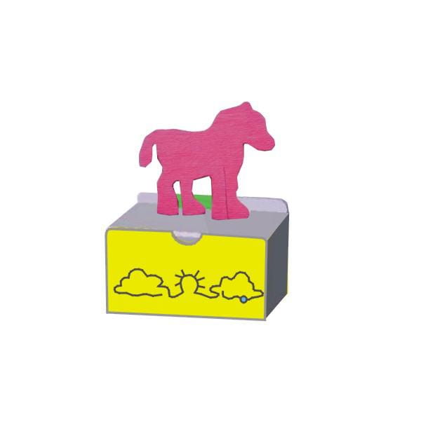 Segmenty wykonany z płyty meblowej 18 mm w kolorze popielatym. Drzwi standardowo w kolorach żółtym lub niebieskim. Ścianka manipulacyjna umożliwia wykonywanie ćwiczeń manualnych przez dzieci. W części środkowej szuflada wysuwana. Koń wykonany z płyty mdf, malowany w pastelowych kolorach, wielkości ok 600 mm, uatrakcyjnia wygląd wyrobu.