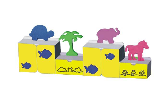 Segmenty wykonany z płyty meblowej 18 mm w kolorze popielatym. Drzwi standardowo w kolorach żółtym lub niebieskim. W części środkowej szafka z półką. Szafka zamykana jest na zamek z kluczem. Słoń i żółw wykonane z płyty mdf, malowany w pastelowych kolorach, wielkości ok 500 mm uatrakcyjnia wygląd wyrobu.Ścianka manipulacyjna umożliwia wykonywanie ćwiczeń manualnych przez dzieci.
