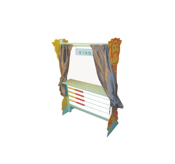Teatrzyk mały ułatwia grupowe zabawy dzieci w sklep, dom, bank, itp. Scenka składa się z jednego skrzydła, jako ściana z okienkiem kasowym, sklepowym. Po bokach scenki umiejscowione są kolorowe żyrafy, które uatrakcyjniają wizerunek scenki. W wyposażeniu mamy przesuwaną zasłonkę, 3 przykładowe zawieszki np: sklep, bank, poczta, oraz liczydlo z czterema prętami, kulki plastikowe pełne.