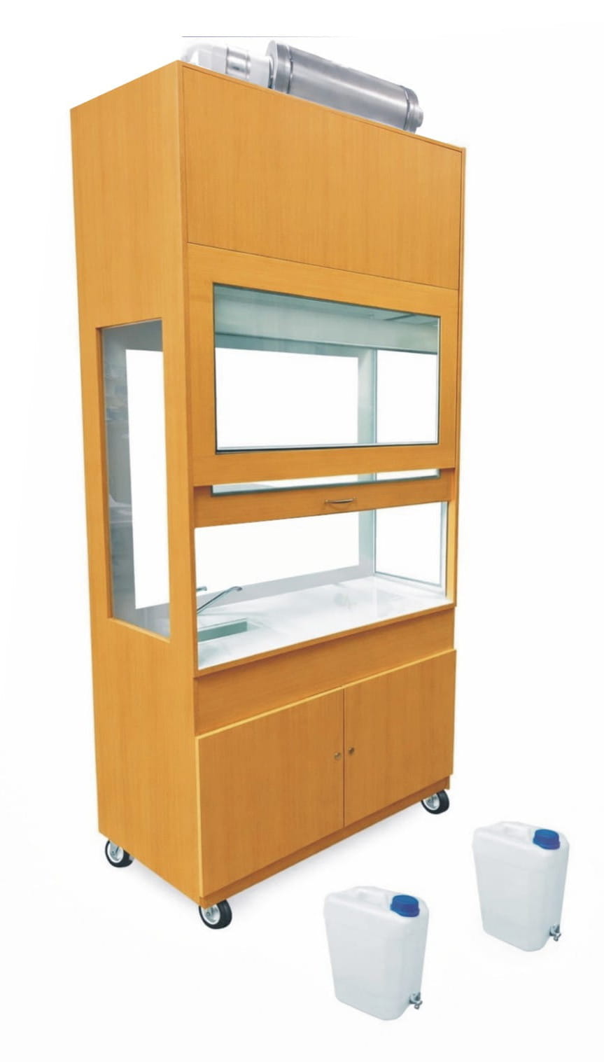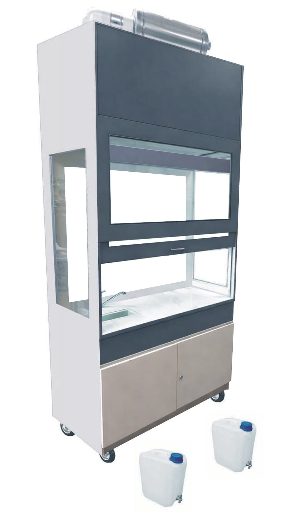 -dolnej: szafki dwudrzwiowej z zamontowanym syfonem, dygestorium posiada w wyposażeniu dwa zbiorniki na wodę (czystą i ścieki), 20l każdy, pompę wodną 24V, baterię z włącznikiem pompy wodnej, kółka obrotowe z hamulcem.
