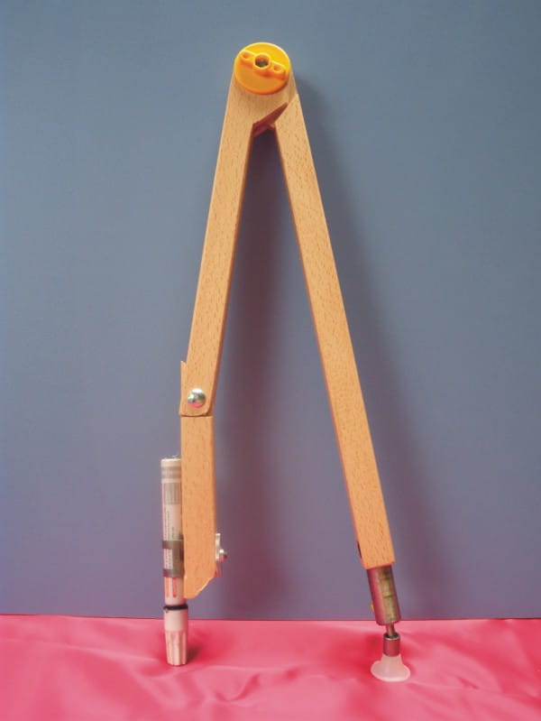 Cyrkiel wyprodukowany jest z drewna liściastego. Ramiona są połączone śrubą zamkową z nakrętką motylkową. Jedno ramię ma metalowy uchwyt na jednonóg. Drugie (podwójnie łamane) pozwala zamontować pisak w specjalnym uchwycie.