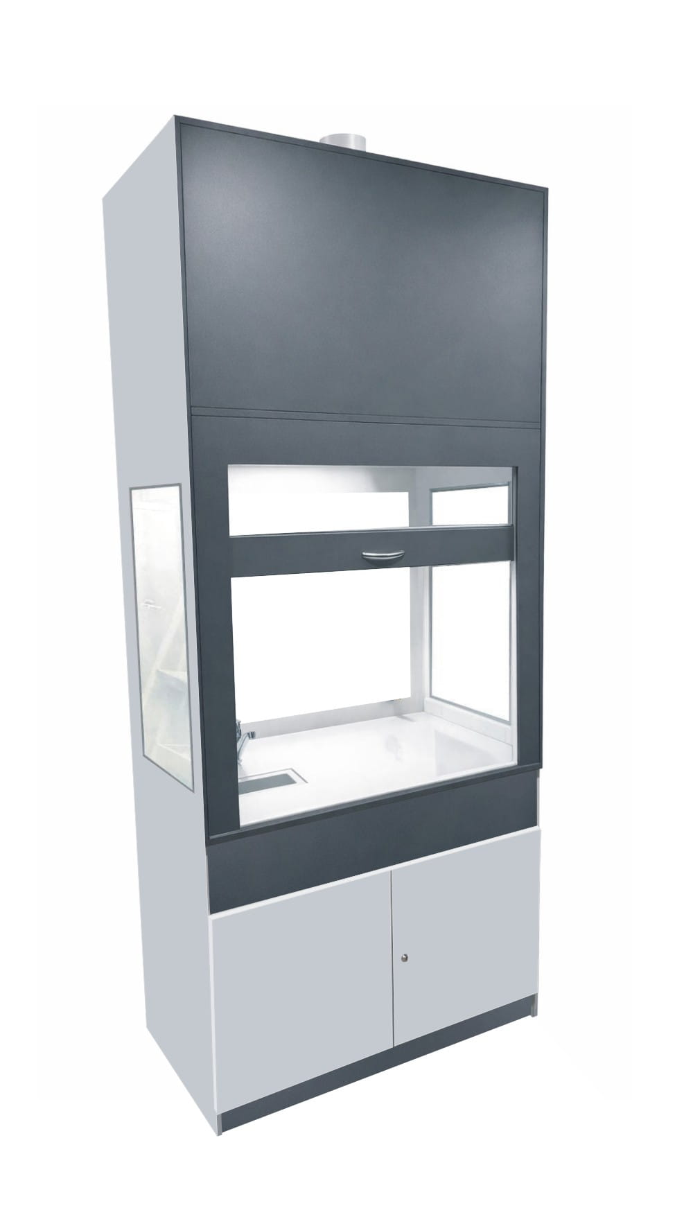 W komorze zamocowana jest przesuwana okiennica podnoszona za pomocą systemu „Fennel”. Pozwala on na ustawienie okiennicy (góra-dół) w dowolnym położeniu. Dygestorium w standardzie posiada wentylację wywiewną sufitową. Wentylator z płytą montażową stanowi wyodrębnioną część wyciągu do montażu na otworze kominowym. W standardzie wentylator kanałowy dwubiegowy o mocy 350-500m3//h. Króciec wylotowy wentylacji fi 150mm. Instalacja wyciągowa wykonana jest z polistyrenu w wersji podstawowej. Całość na nośniku laminatu. Dygestorium jest dostępne w trzech kolorach: biały, buk, popiel.