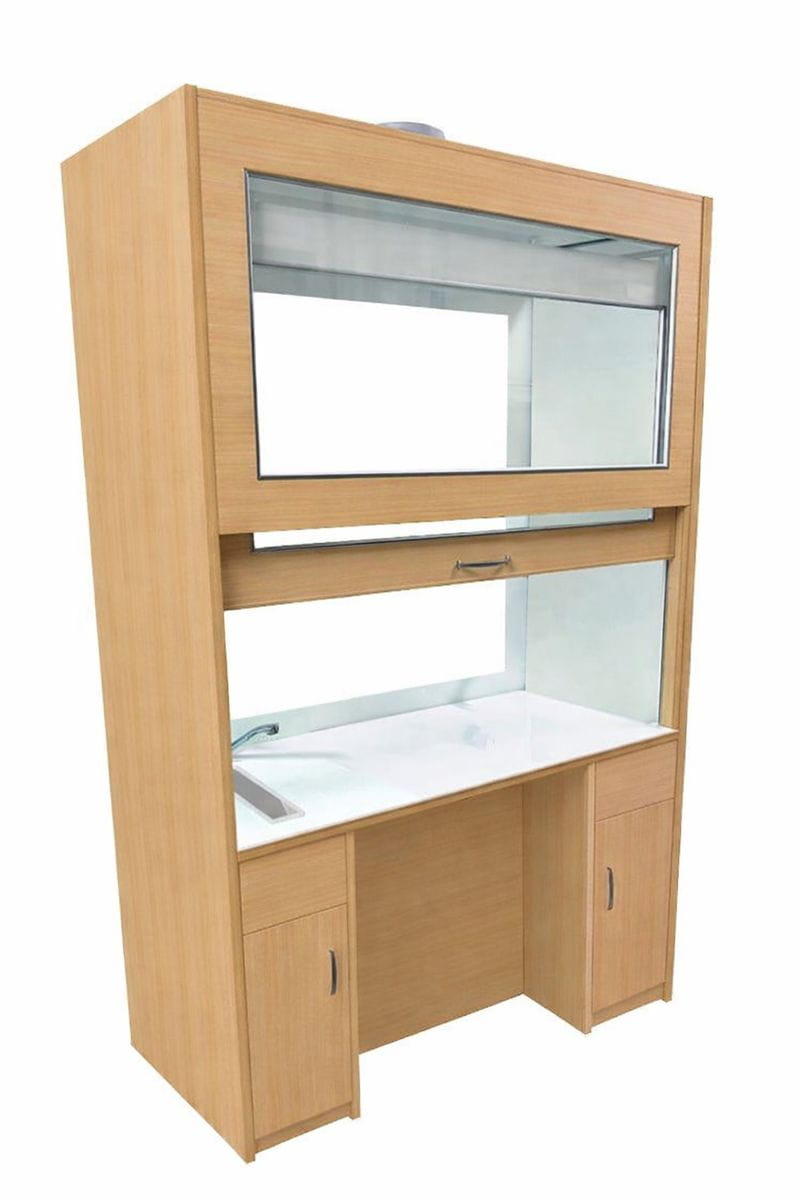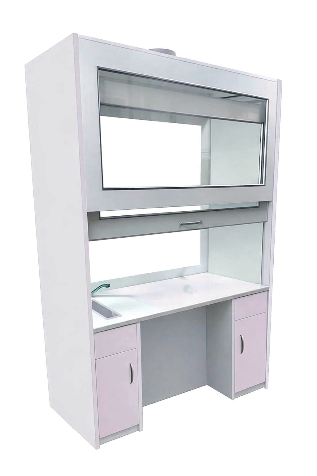 W górnej komorze zamocowana jest przesuwana okiennica podnoszona za pomocą systemu „Fennel”. Pozwala on na ustawienie okiennicy (góra-dół) w dowolnym położeniu. Wentylator z płytą montażową stanowi wyodrębnioną część wyciągu do montażu na otworze kominowym. W standardzie wentylator kanałowy o mocy 350-500 m3/h dwubiegowy. Instalacja wyciągowa wykonana jest z polistyrenu w wersji podstawowej. Króciec wyciągowy na suficie fi 150mm. Dygestorium posiada system wentylacji wywiewny. Całość na nośniku płyty laminowanej. Nóżki regulacyjne niewidoczne z zewnątrz, umożliwiają wypoziomowanie urządzenia. Dygestorium komfort posiada miejsce na nogi, co umożliwia wygodną pracę przy dygestorium w pozycji siedzącej. Digestorium jest dostępne w trzech kolorach: biały, buk, popiel. Dodatkowe kolory na specjalne zamówienie.