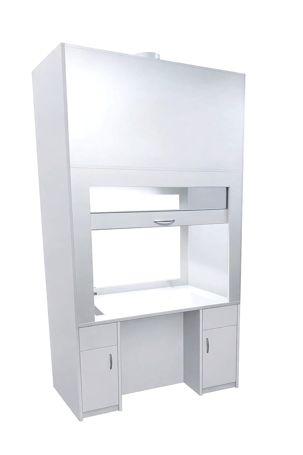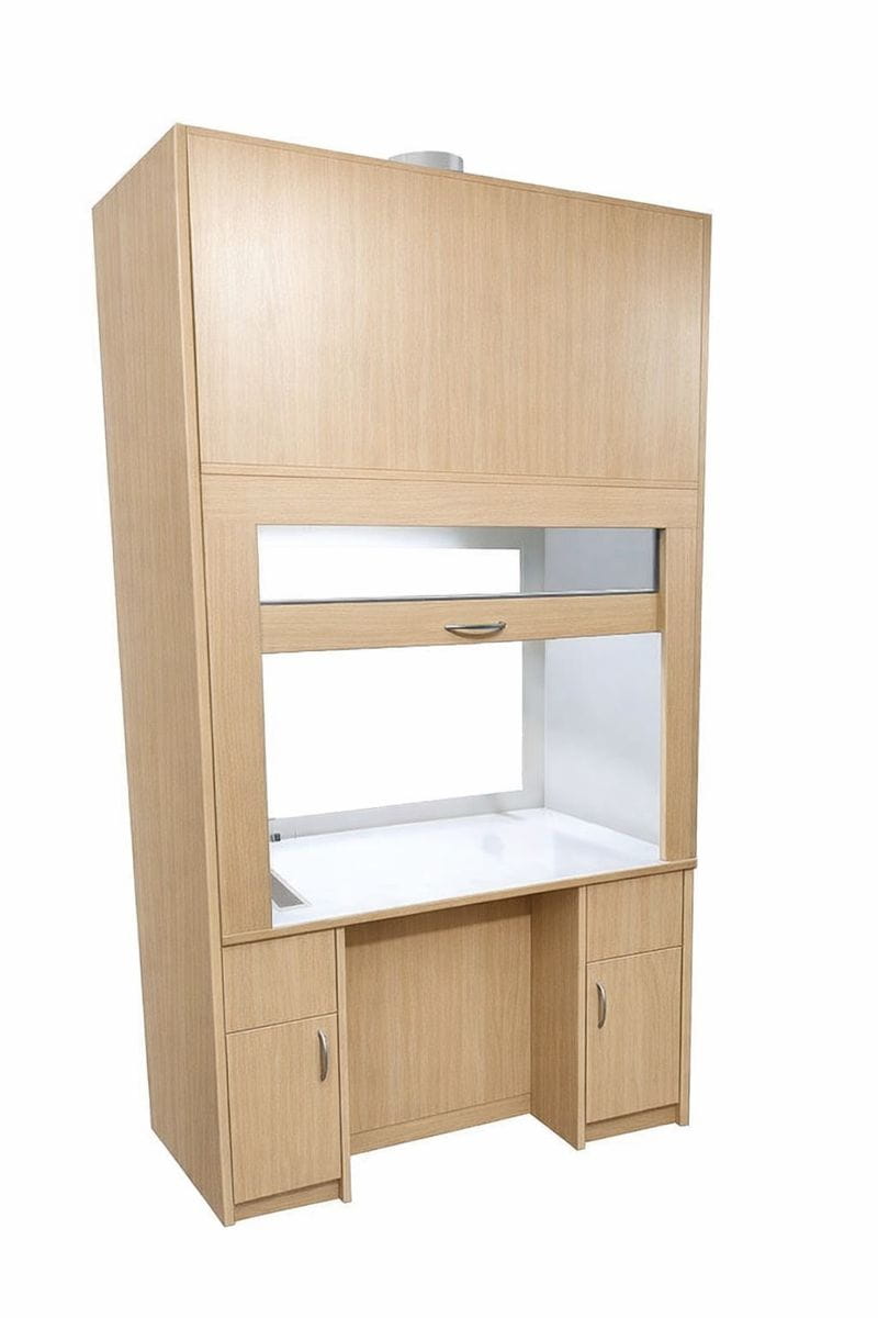 W komorze zamocowana jest przesuwana okiennica podnoszona za pomocą systemu „Fennel”. Pozwala on na ustawienie okiennicy (góra-dół) w dowolnym położeniu. Dygestorium w standardzie posiada wentylację wywiewną sufitową. Wentylator z płytą montażową stanowi wyodrębnioną część wyciągu do montażu na otworze kominowym. W standardzie wentylator kanałowy dwubiegowy o mocy 350-500m3//h. Króciec wylotowy wentylacji fi 150mm. Nóżki z możliwością regulacji umożliwiają wypoziomowanie urządzenia. Instalacja wyciągowa wykonana jest z polistyrenu w wersji podstawowej. Całość na nośniku laminatu. Dygestorium komfort posiada miejsce na nogi, co umożliwia wygodną pracę przy dygestorium w pozycji siedzącej. Dygestorium jest dostępne w trzech kolorach: biały, buk, popiel.