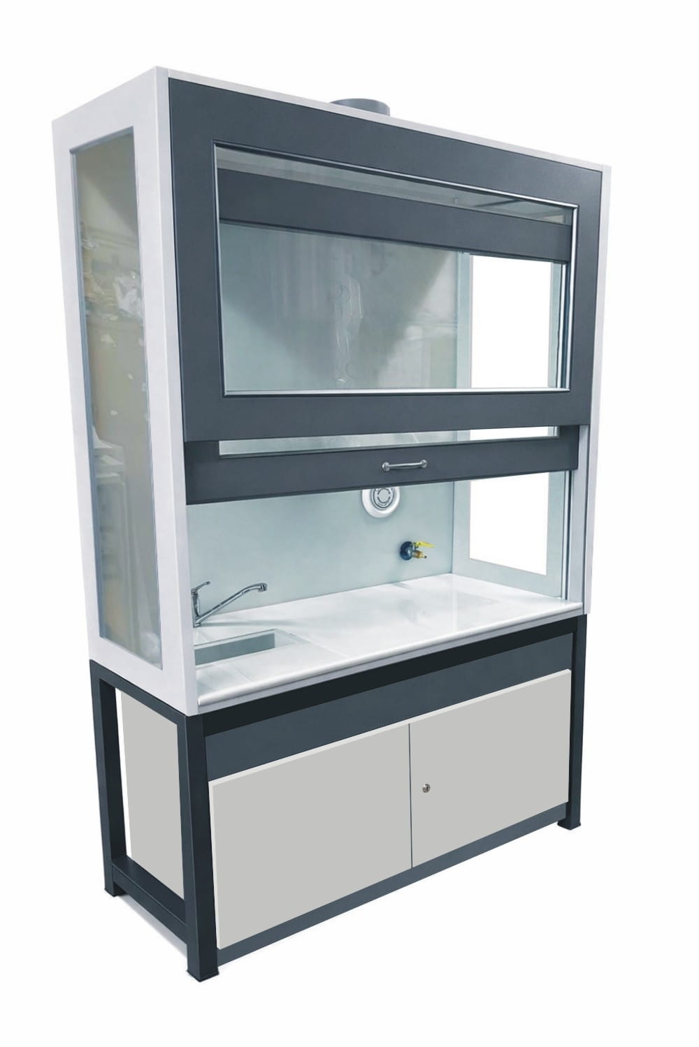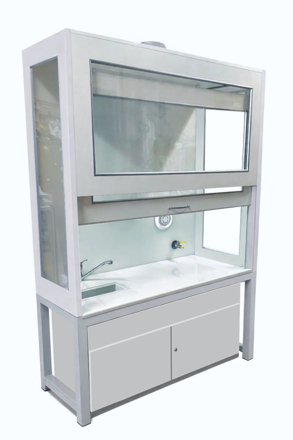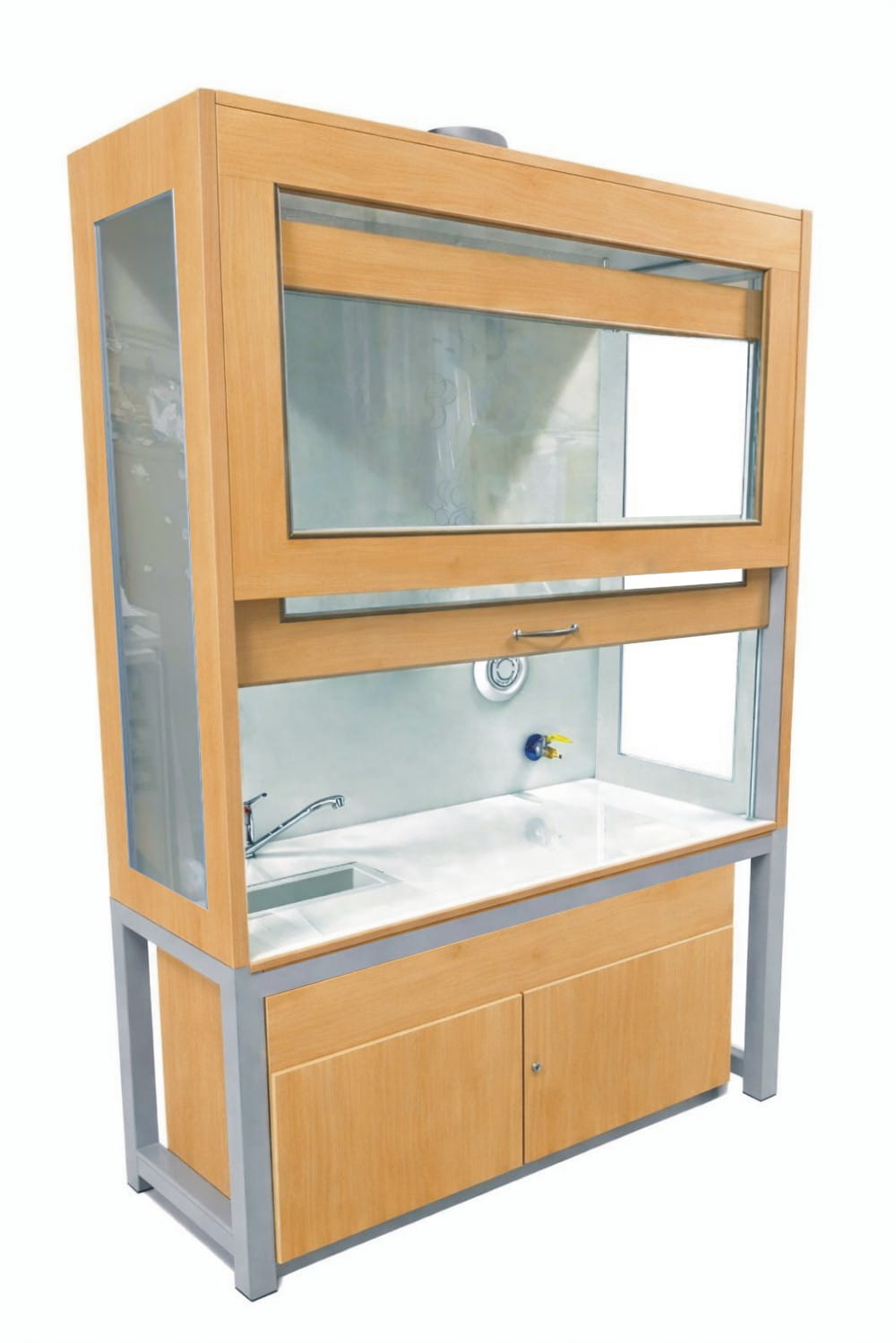 W górnej komorze zamocowana jest przesuwana okiennica podnoszona za pomocą systemu „Fennel”. Pozwala on na ustawienie okiennicy (góra-dół) w dowolnym położeniu. Wentylator z płytą montażową stanowi wyodrębnioną część wyciągu do montażu na otworze kominowym. W standardzie wentylator kanałowy o mocy 350-500 m3/h dwubiegowy. Instalacja wyciągowa wykonana jest z polistyrenu w wersji podstawowej. Króciec wyciągowy na suficie fi 150mm. Dygestorium posiada system wentylacji wywiewny. Całość dolnej części dygestorium oparta na solidnym stelażu z profili metalowych o grubości 4 cm. Do stelaża przymocowana jest szafka z płyty laminowanej z otwieranymi drzwiczkami. Dygestorium wykonane jest w wersji komfort, co umożliwia wygodne korzystanie z urządzenia z pozycji siedzącej. Nóżki regulacyjne niewidoczne z zewnątrz, umożliwiają wypoziomowanie dygestorium. Dygestorium jest dostępne w trzech kolorach: biały, buk, popiel. Dodatkowe kolory na specjalne zamówienie.