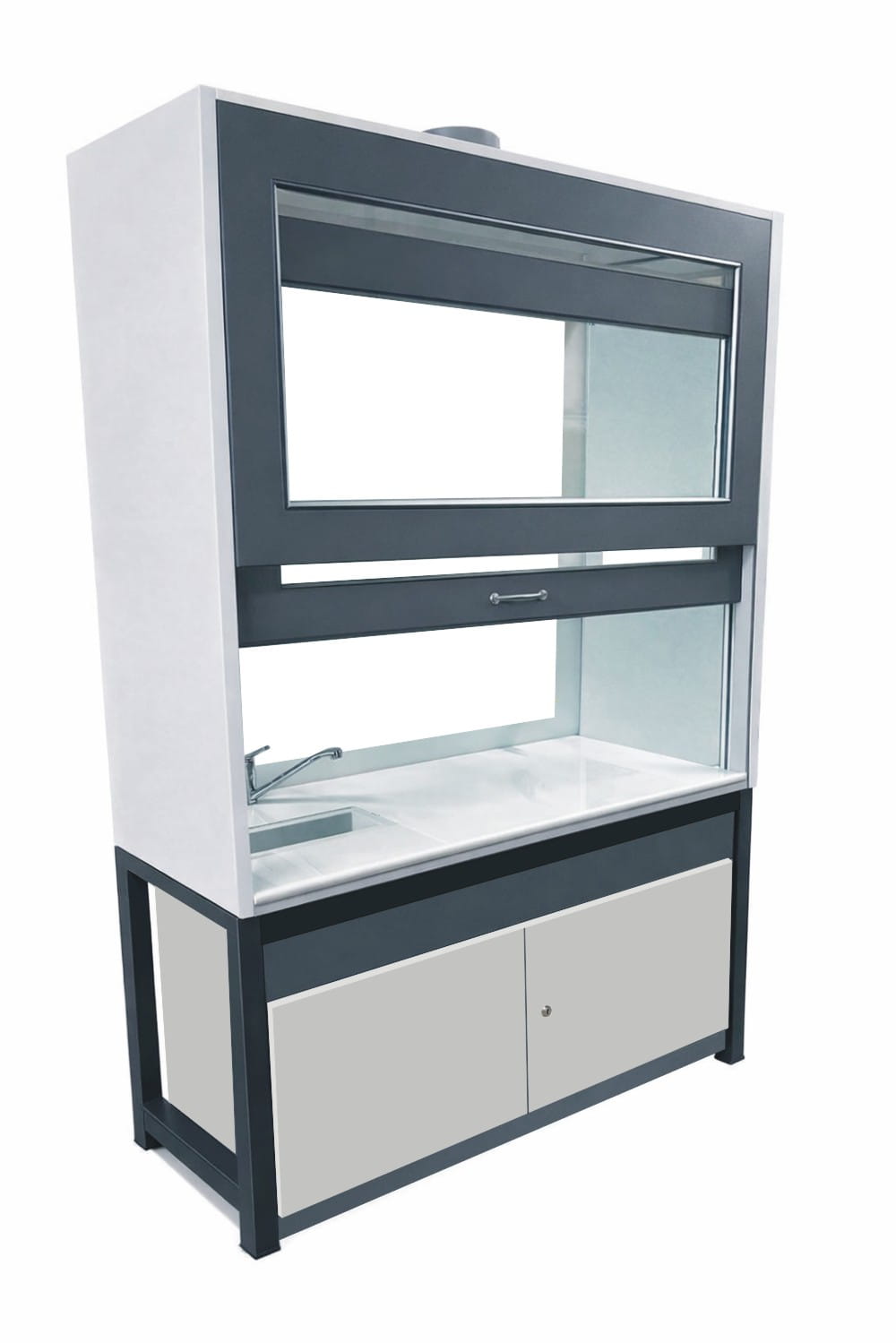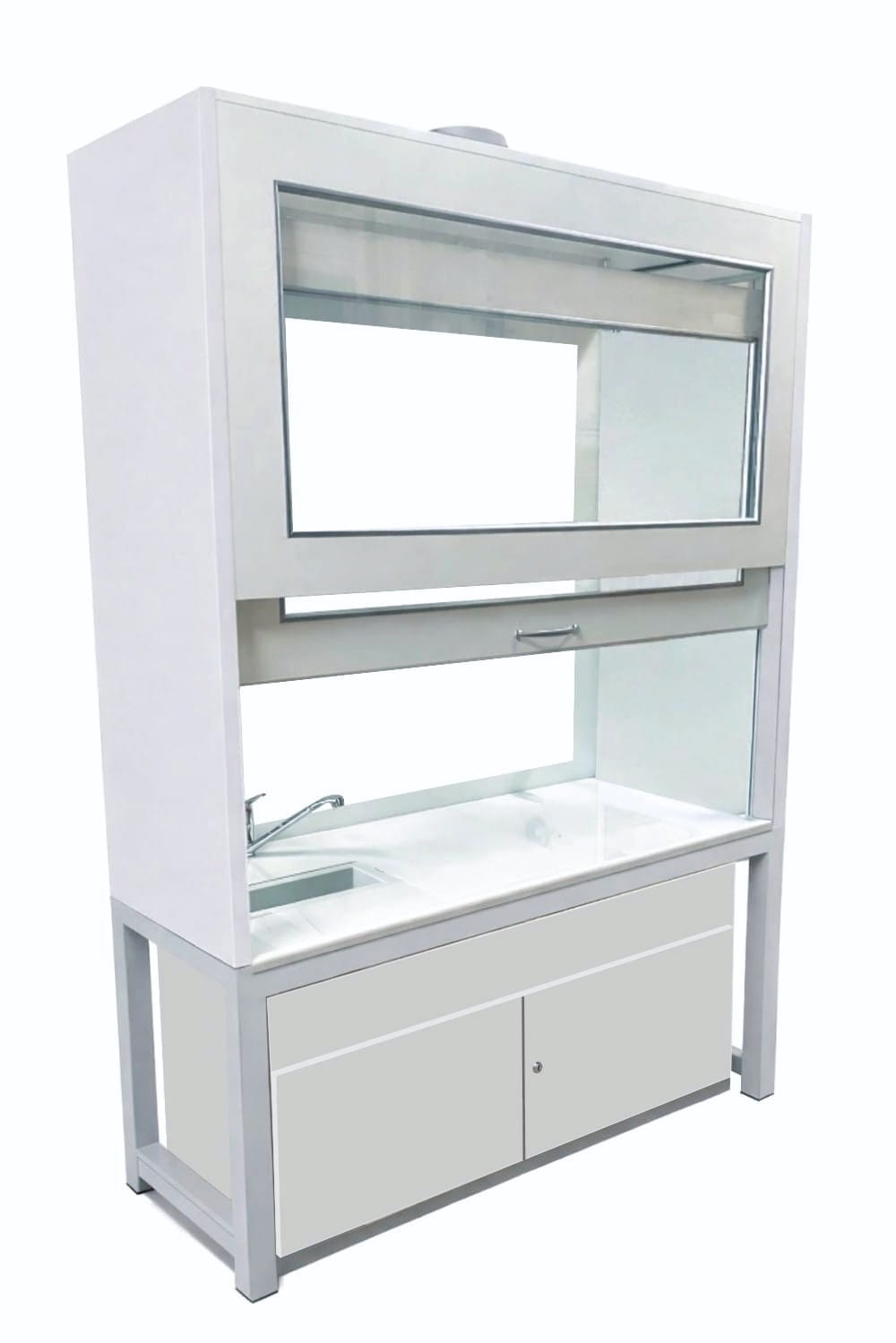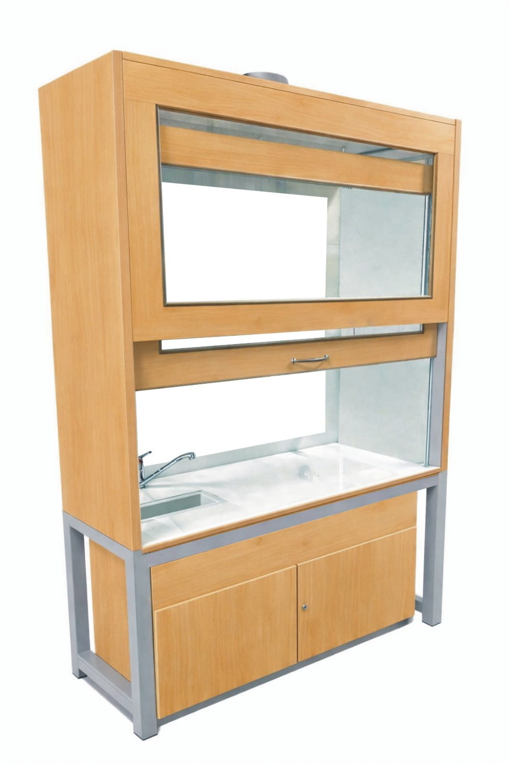 W górnej komorze zamocowana jest przesuwana okiennica podnoszona za pomocą systemu „Fennel”. Pozwala on na ustawienie okiennicy (góra-dół) w dowolnym położeniu. Wentylator z płytą montażową stanowi wyodrębnioną część wyciągu do montażu na otworze kominowym. W standardzie wentylator kanałowy o mocy 350-500 m3/h dwubiegowy. Instalacja wyciągowa wykonana jest z polistyrenu w wersji podstawowej. Króciec wyciągowy na suficie fi 150mm. Dygestorium posiada system wentylacji wywiewny. Całość dolnej części dygestorium oparta na solidnym stelażu z profili metalowych o grubości 4 cm. Do stelaża przymocowana jest szafka z płyty laminowanej z otwieranymi drzwiczkami. Dygestorium wykonane jest w wersji komfort, co umożliwia wygodne korzystanie z urządzenia z pozycji siedzącej. Nóżki regulacyjne niewidoczne z zewnątrz, umożliwiają wypoziomowanie urządzenia. Dygestorium jest dostępne w trzech kolorach: biały, buk, popiel. Dodatkowe kolory na specjalne zamówienie.