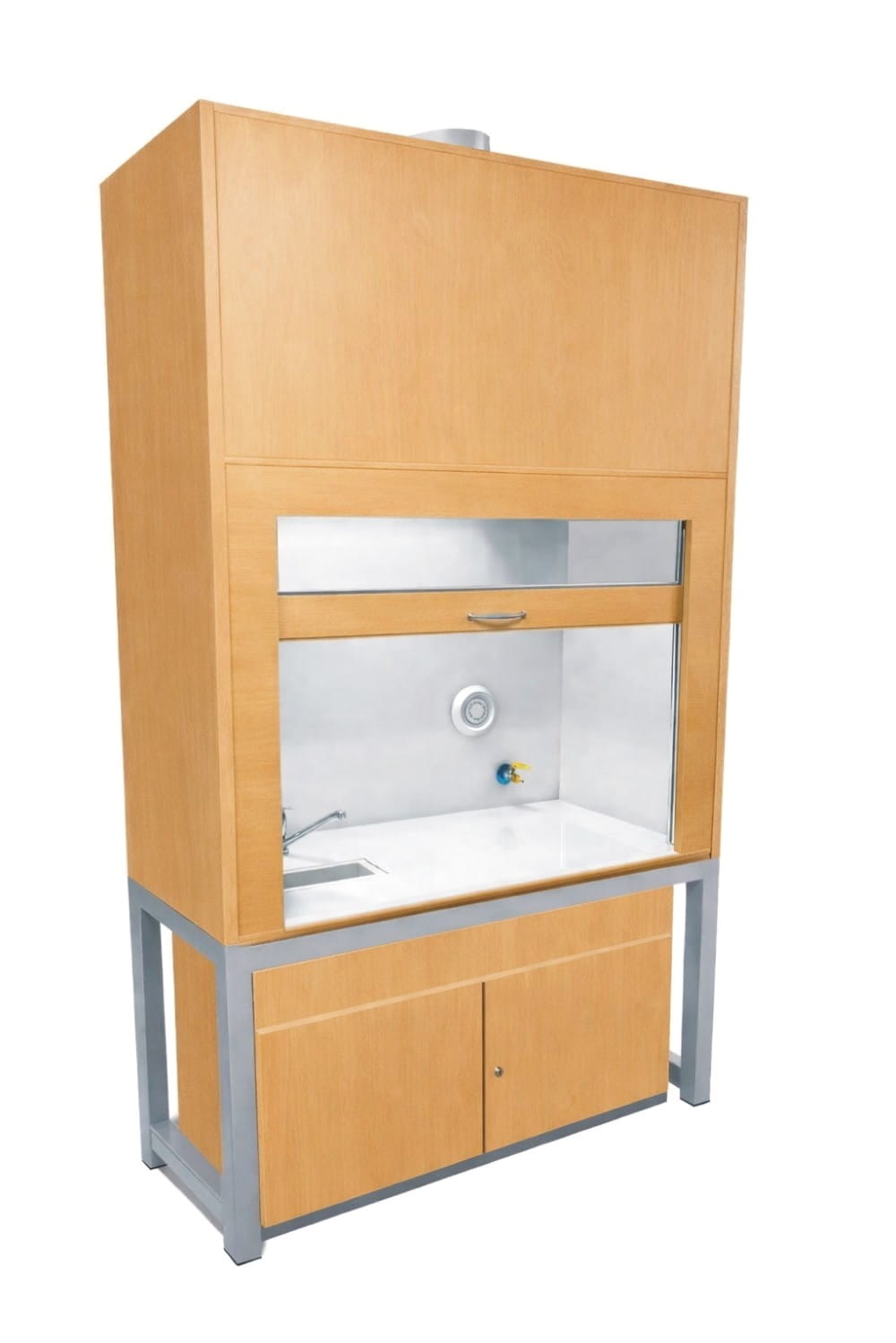 W komorze zamocowana jest przesuwana okiennica podnoszona za pomocą systemu „Fennel”. Pozwala on na ustawienie okiennicy (góra-dół) w dowolnym położeniu. Dygestorium w standardzie posiada wentylację wywiewną sufitową. Wentylator z płytą montażową stanowi wyodrębnioną część wyciągu do montażu na otworze kominowym. W standardzie wentylator kanałowy dwubiegowy o mocy 350-500m3//h. Króciec wylotowy wentylacji fi 150mm. Instalacja wyciągowa wykonana jest z polistyrenu w wersji podstawowej. Całość dolnej części dygestorium oparta na solidnym stelażu z profili metalowych o grubości 4 cm. Do stelaża przymocowana jest szafka z płyty laminowawej z otwieranymi drzwiczkami. Dygestorium wykonane jest w wersji komfort, co umożliwia wygodne korzystanie z urządzenia z pozycji siedzącej. Nóżki z możliwością regulacji umożliwiają wypoziomowanie urządzenia. Dygestorium jest dostępne w trzech kolorach: biały, buk, popiel.