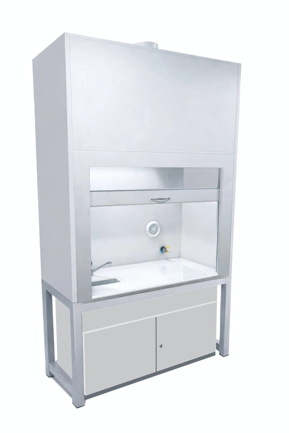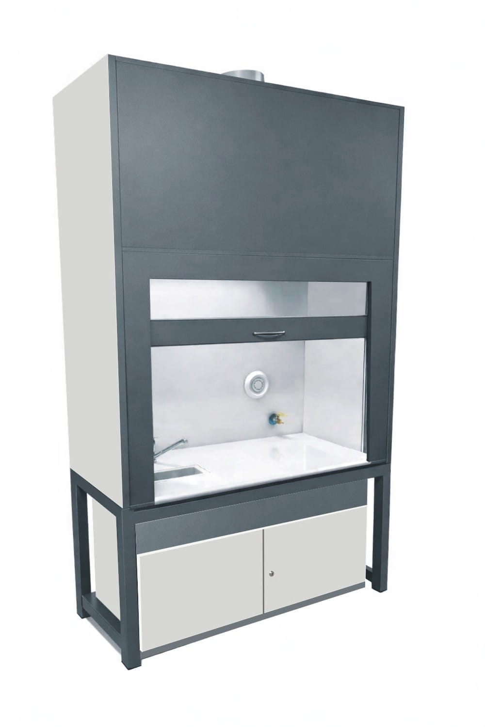 -górnej: komory manipulacyjnej z płytą polipropylenową odporną na kwasy i zasady do wysokości sufitu. Komora wyposażona jest w zlew polipropylenowy, baterie, anemostat nawiewny, zawór gazowy, blat wykonany w standardzie z litej ceramiki technicznej.W dygestorium w standardzie znajduje się nadstawka oświetleniowa. Oświetlenie jest oddzielone szybą od części roboczej dygestorium, co zapewnia bezpieczne doświetlenie części roboczej dygestorium.
