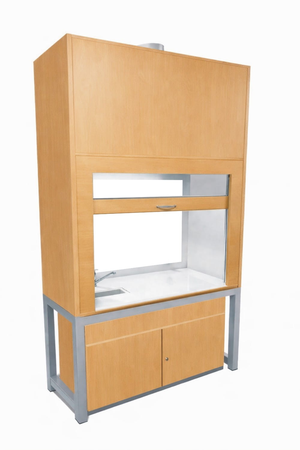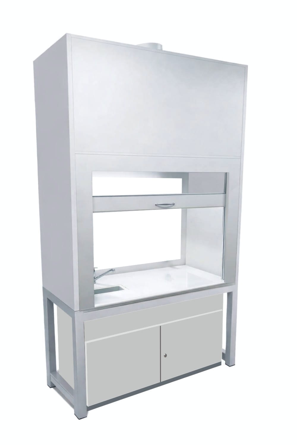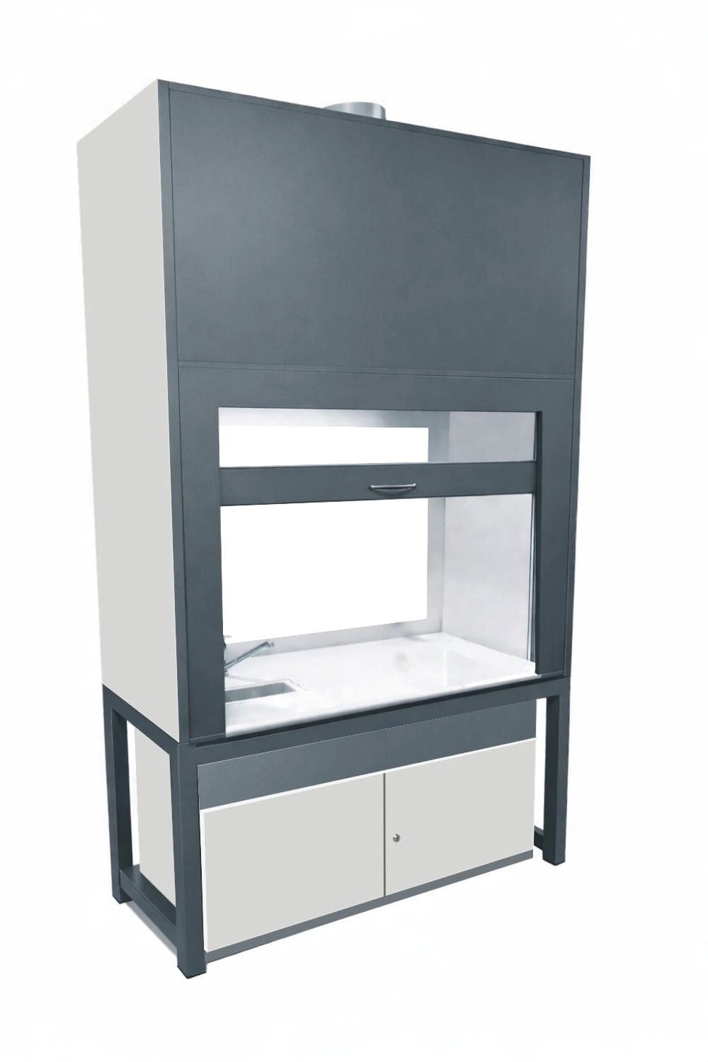 W komorze zamocowana jest przesuwana okiennica podnoszona za pomocą systemu „Fennel”. Pozwala on na ustawienie okiennicy (góra-dół) w dowolnym położeniu. Dygestorium w standardzie posiada wentylację wywiewną sufitową. Wentylator z płytą montażową stanowi wyodrębnioną część wyciągu do montażu na otworze kominowym. W standardzie wentylator kanałowy dwubiegowy o mocy 350-500m3//h. Króciec wylotowy wentylacji fi 150mm. Instalacja wyciągowa wykonana jest z polistyrenu w wersji podstawowej. Całość dolnej części dygestorium oparta na solidnym stelażu z profili metalowych o grubości 4 cm. Do stelaża przymocowana jest szafka z płyty laminowanej z otwieranymi drzwiczkami. Dygestorium wykonane jest w wersji komfort, co umożliwia wygodne korzystanie z urządzenia z pozycji siedzącej. Nóżki regulacyjne niewidoczne z zewnątrz, umożliwiają wypoziomowanie dygestorium. Nóżki z możliwością regulacji umożliwiają wypoziomowanie urządzenia. Dygestorium jest dostępne w trzech kolorach: biały, buk, popiel.