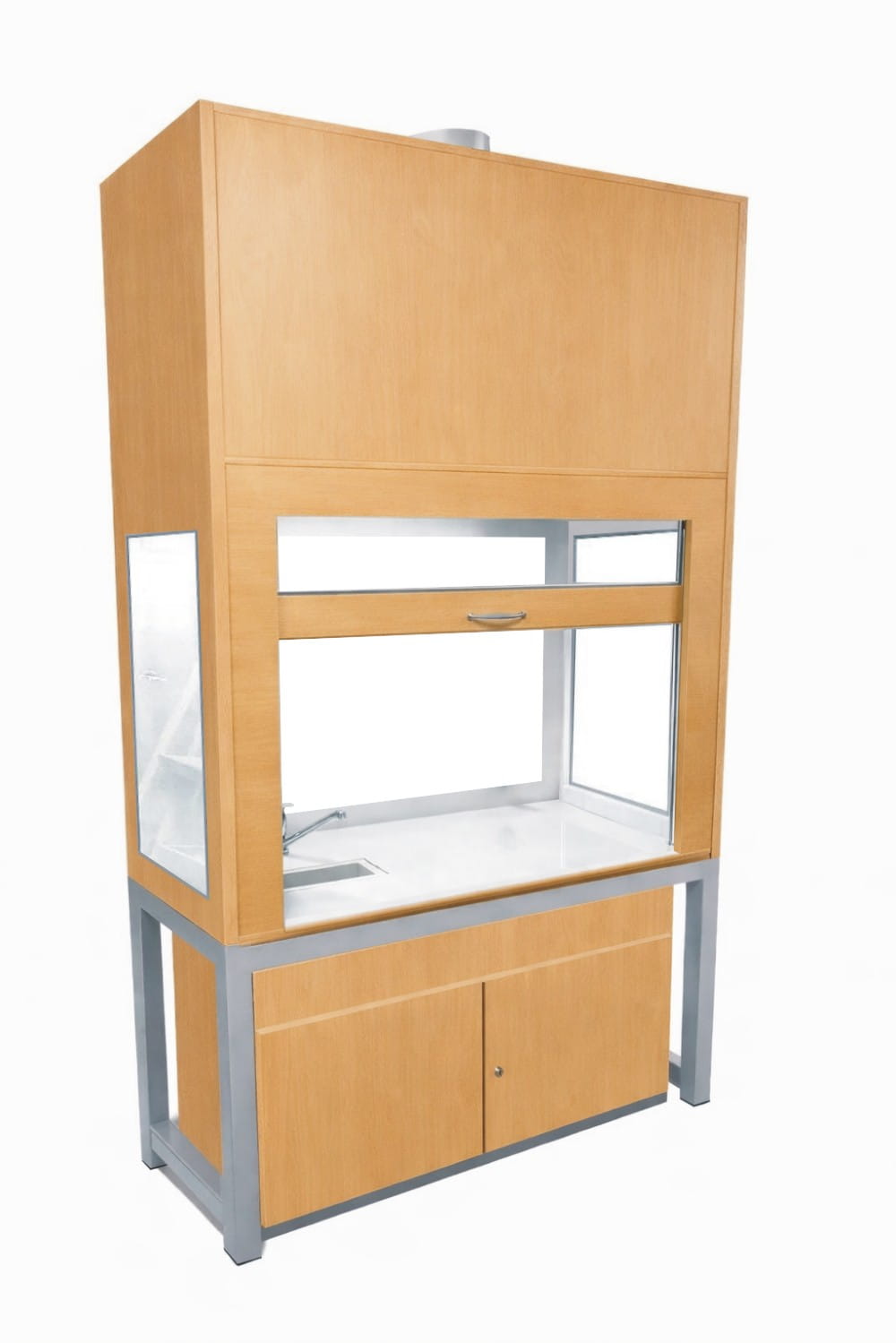 W komorze zamocowana jest przesuwana okiennica podnoszona za pomocą systemu „Fennel”. Pozwala on na ustawienie okiennicy (góra-dół) w dowolnym położeniu. Dygestorium w standardzie posiada wentylację wywiewną sufitową. Wentylator z płytą montażową stanowi wyodrębnioną część wyciągu do montażu na otworze kominowym. W standardzie wentylator kanałowy dwubiegowy o mocy 350-500m3//h. Króciec wylotowy wentylacji fi 150mm. Instalacja wyciągowa wykonana jest z polistyrenu w wersji podstawowej. Całość dolnej części dygestorium oparta na solidnym stelażu z profili metalowych o grubości 4 cm. Do stelaża przymocowana jest szafka z płyty laminowanej z otwieranymi drzwiczkami. Dygestorium wykonane jest w wersji komfort, co umożliwia wygodne korzystanie z urządzenia z pozycji siedzącej. Do stelaża przymocowana jest szafka z płyty laminowanej z otwieranymi drzwiczkami. Dygestorium wykonane jest w wersji komfort, co umożliwia wygodne korzystanie z urządzenia z pozycji siedzącej. Nóżki z możliwością regulacji umożliwiają wypoziomowanie urządzenia. Dygestorium jest dostępne w trzech kolorach: biały, buk, popiel.