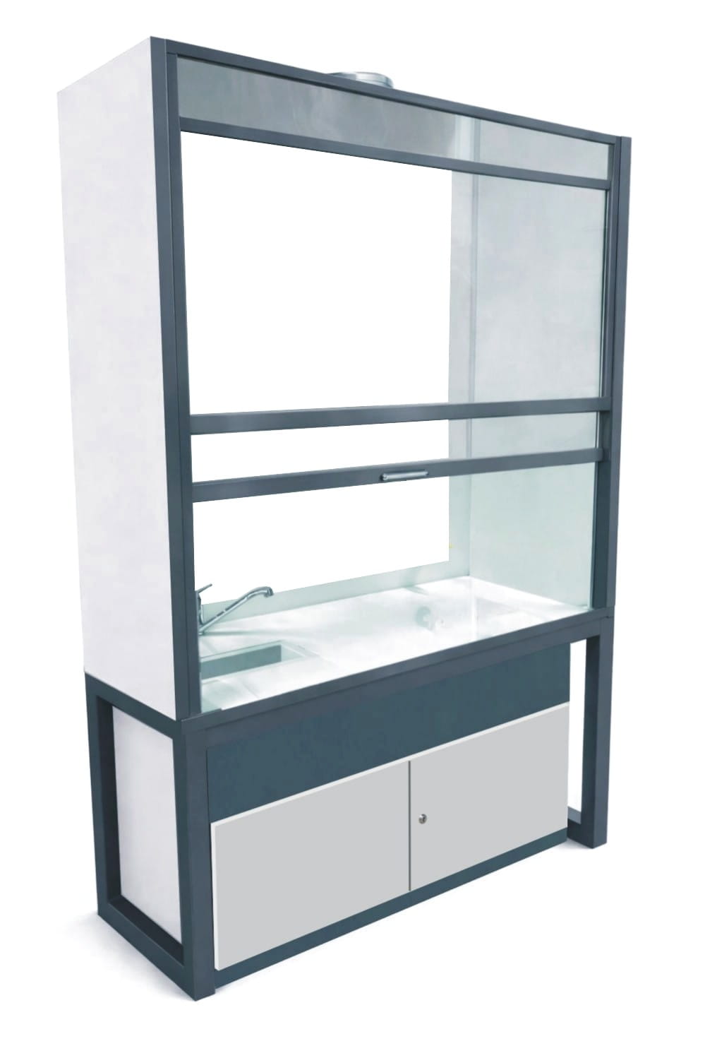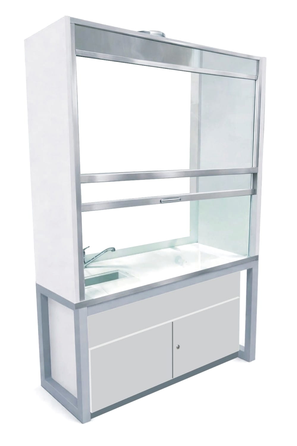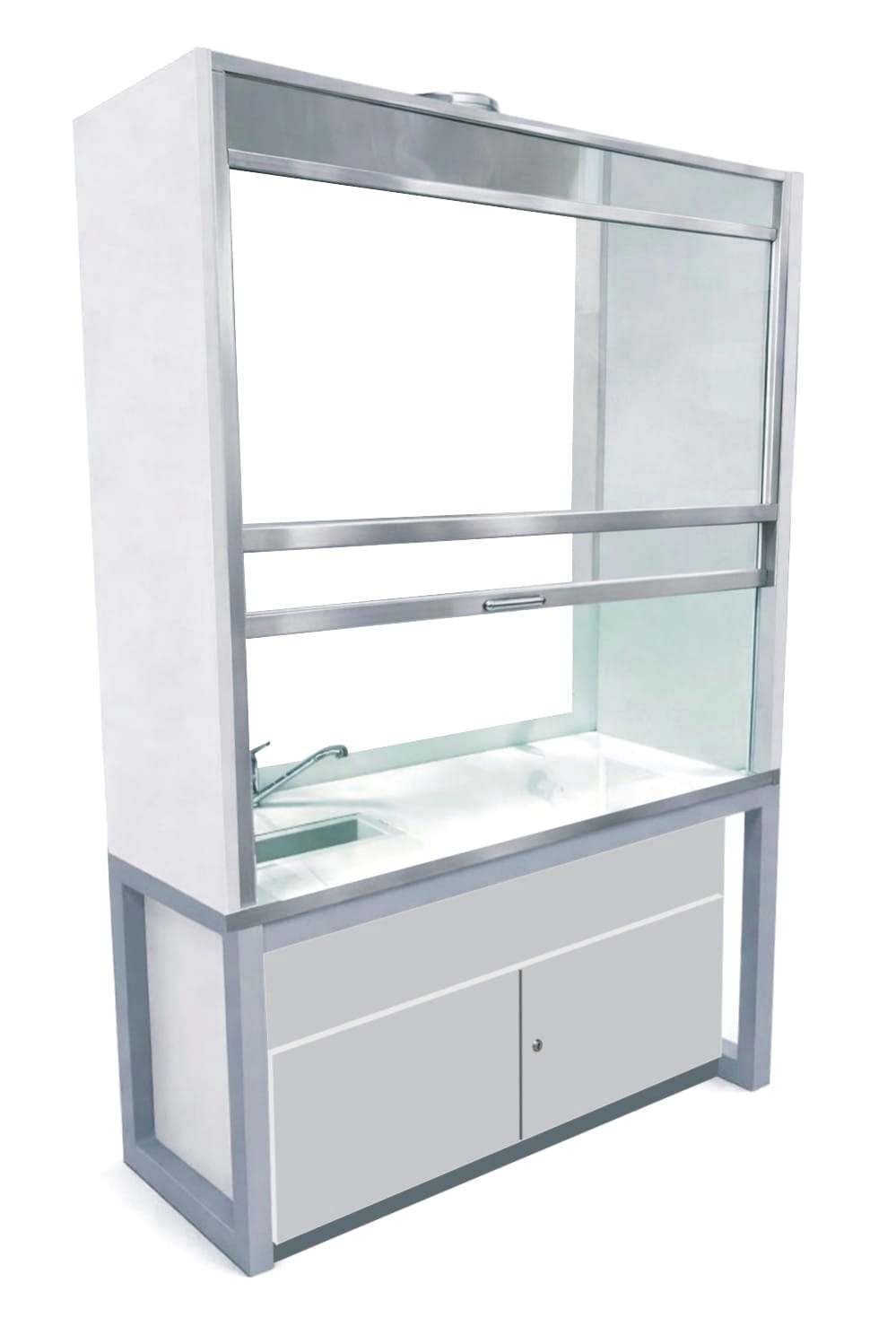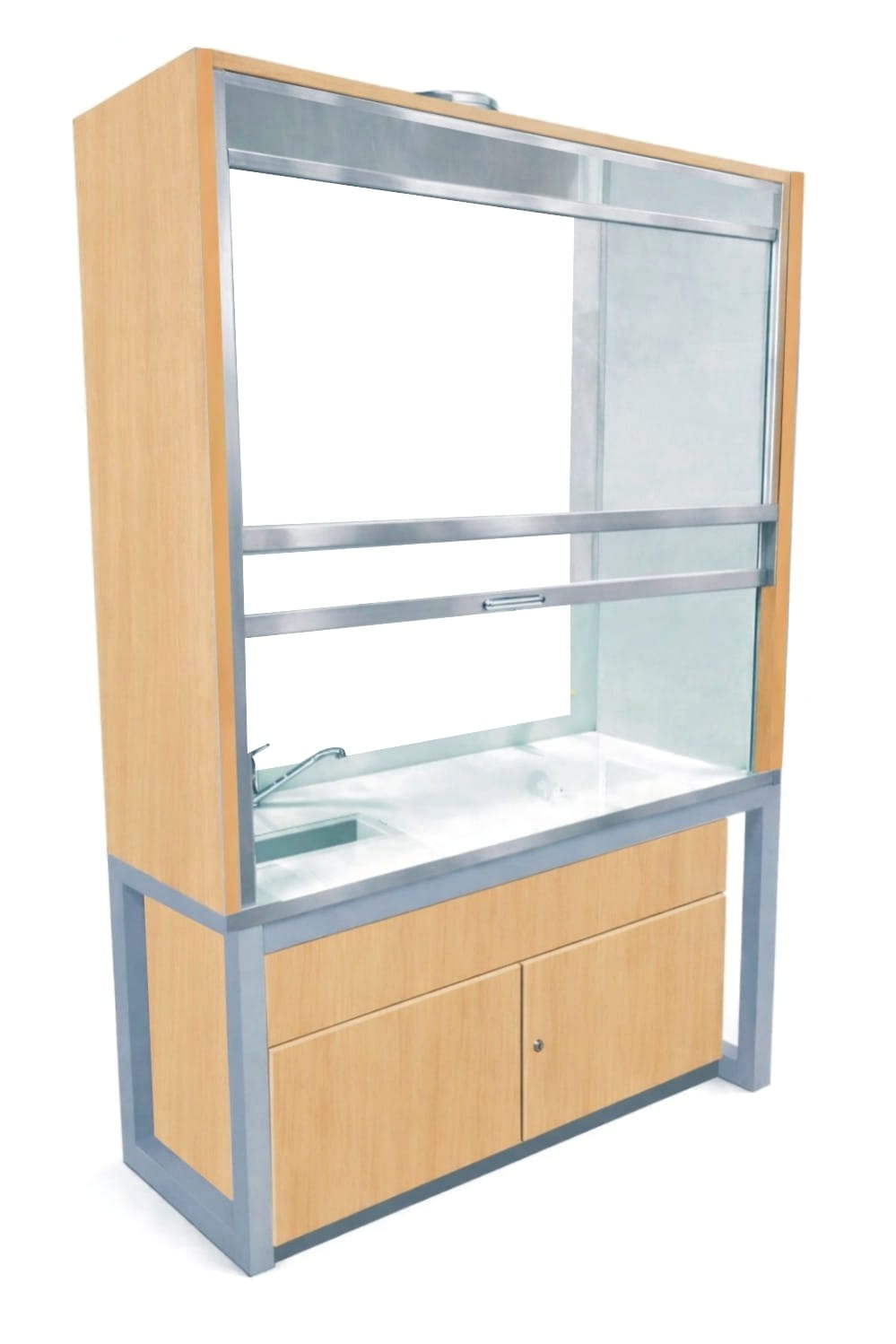 W górnej komorze zamocowana jest przesuwana okiennica podnoszona za pomocą systemu „Fennel”. Pozwala on na ustawienie okiennicy (góra-dół) w dowolnym położeniu. Wentylator z płytą montażową stanowi wyodrębnioną część wyciągu do montażu na otworze kominowym. W standardzie wentylator kanałowy o mocy 350-500 m3/h dwubiegowy. Instalacja wyciągowa wykonana jest z polistyrenu w wersji podstawowej. Króciec wyciągowy na suficie fi 150mm. Dygestorium laboratoryjne posiada system wentylacji wywiewny. Całość dolnej części dygestorium oparta na solidnym stelażu z profili metalowych o grubości 4 cm. Do stelaża przymocowana jest szafka z płyty laminowawanej z otwieranymi drzwiczkami. Nóżki regulacyjne niewidoczne z zewnątrz, umożliwiają wypoziomowanie urządzenia. Dygestorium jest dostępne w trzech kolorach: biały, buk, popiel. Dodatkowe kolory na specjalne zamówienie.