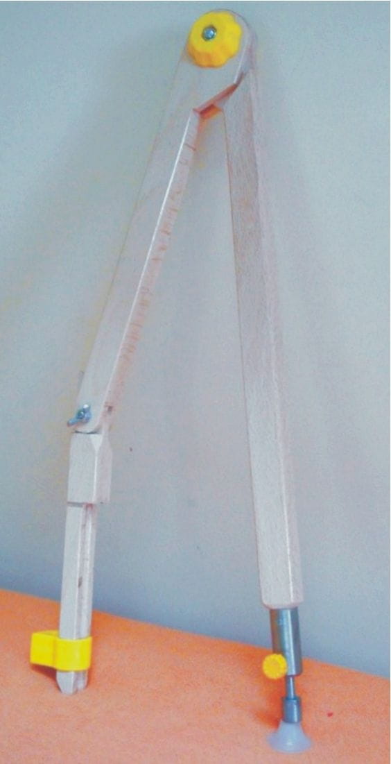 Cyrkiel wyprodukowany jest z drewna liściastego. Elementy mocujące wykonane są z twardego PCV. Jedno ramię posiada jednonóg z gumką. Drugie (podwójnie łamane) pozwala zamontować pisak do tablic sucho-ściernych lub kredę do tablic mokro-ściernych w specjalnym uchwycie.