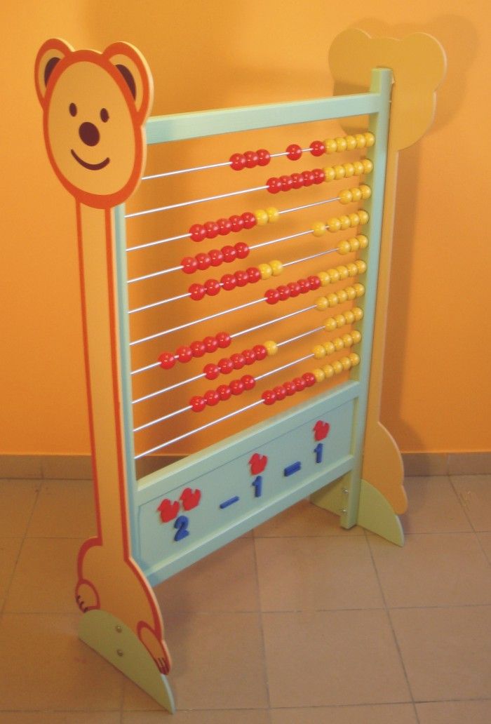 Wykonane jako pojedyncze skrzydło z ramy drewnianej w pastelowych kolorach. Na prętach umieszczone są zółto-czerwone kulki drewniane o pełne średnicy 34 mm. W dolnej części umieszczone jest działanie matematyczne z wycinanek drewnianych, a na ramionach kolorowe zwierzątka. Po bokach liczydła umiejscowione są ozdobne misie ze sklejki, które uatrakcyjniają wizerunek liczydła. Bajkowy wygląd zachęca do korzystania z liczydła.