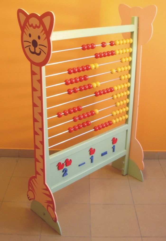 Wykonane jako pojedyncze skrzydło z ramy drewnianej w pastelowych kolorach. Na prętach umieszczone są zółto-czerwone kulki drewniane pełne o średnicy 34 mm. W dolnej części umieszczone jest działanie matematyczne z wycinanek drewnianych, a na ramionach kolorowe zwierzątka. Po bokach liczydła umiejscowione są ozdobne koty ze sklejki, które uatrakcyjniają wizerunek liczydła. Bajkowy wygląd zachęca do korzystania z liczydła.