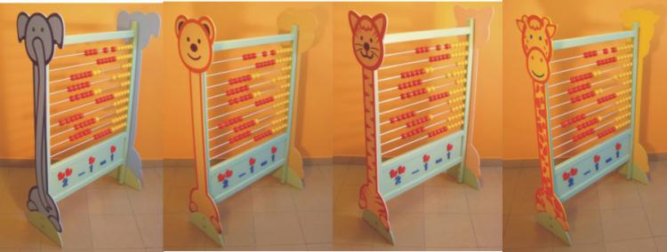 Wykonane jako pojedyncze skrzydło z ramy drewnianej w pastelowych kolorach. Na prętach umieszczone są żółto-czerwone kulki drewniane pełne o średnicy 34 mm. W dolnej części umieszczone jest działanie matematyczne z wycinanek drewnianych. Po bokach liczydła umiejscowione są ozdobne misie, koty, słonie, żyrafy wykonane ze sklejki, które uatrakcyjniają wizerunek liczydeł. Bajkowy wygląd zachęca do korzystania z liczydła.