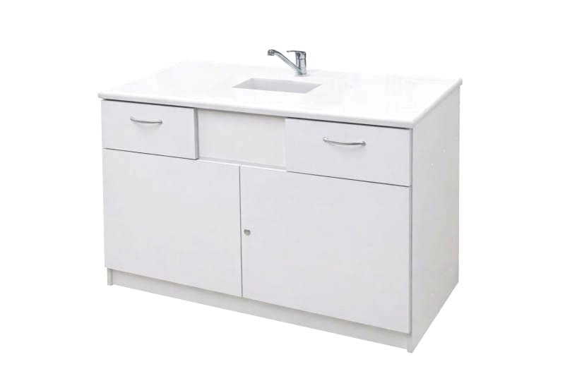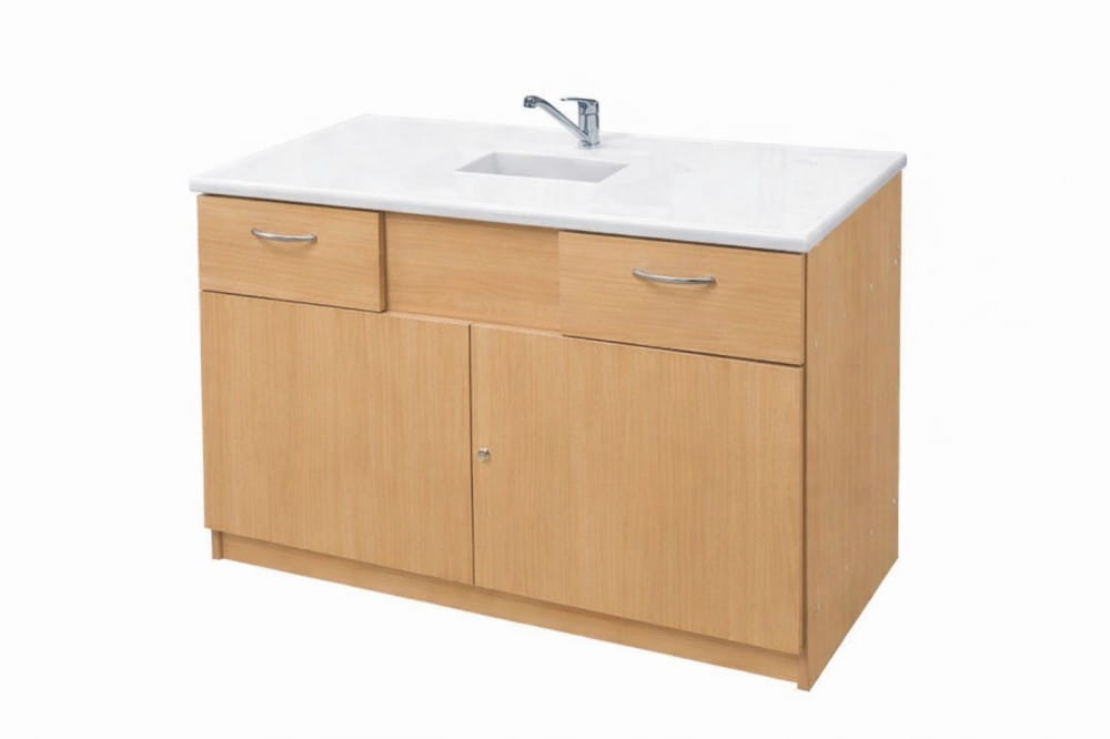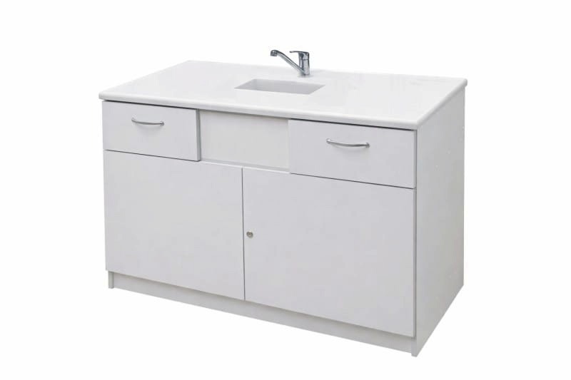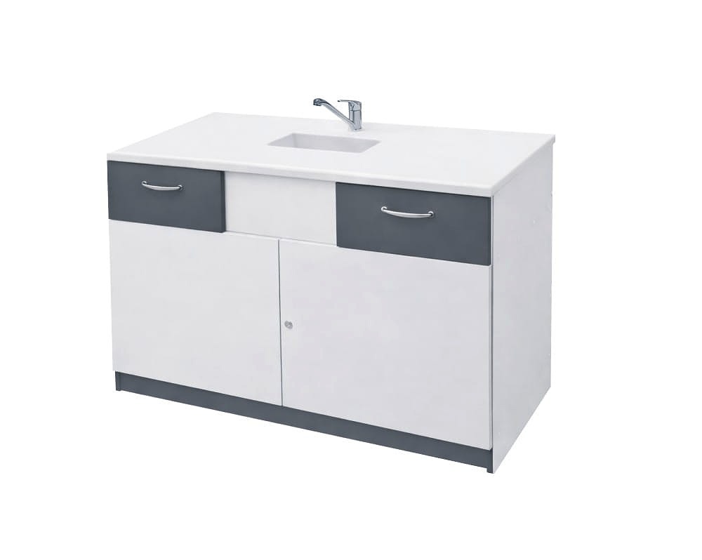 Stolik laboratoryjny jednokomorowy wykonany na konstrukcji płyty laminowanej 18mm, wyposażony w blat pokryty litą ceramiką techniczną, zlew, zawór wodny, dwie szuflady, szafkę zamykaną na klucz. Stolik dostępny w kolorach biały, popiel, buk, modern. Dodatkowe kolory na specjalne zamówienie.