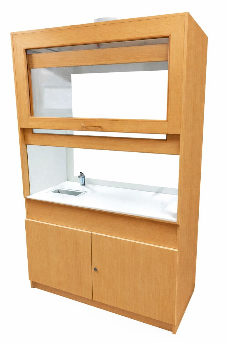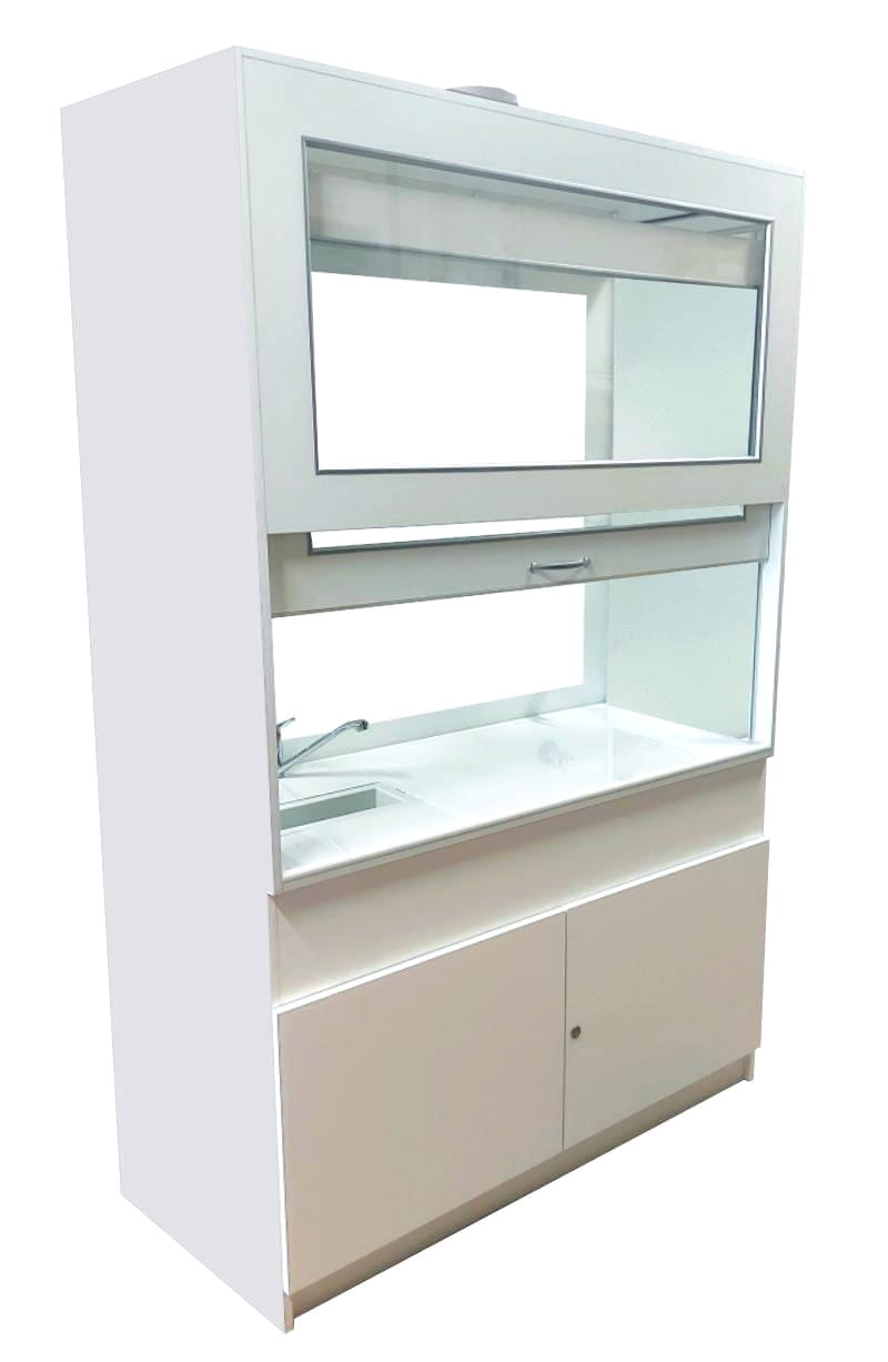 W górnej komorze zamocowana jest przesuwana okiennica podnoszona za pomocą systemu „Fennel”. Pozwala on na ustawienie okiennicy (góra-dół) w dowolnym położeniu. Wentylator z płytą montażową stanowi wyodrębnioną część wyciągu do montażu na otworze kominowym. W standardzie wentylator kanałowy o mocy 350-500 m3/h dwubiegowy. Instalacja wyciągowa wykonana jest z polistyrenu w wersji podstawowej. Króciec wyciągowy na suficie fi 150mm. Dygestorium szkolne Pro-III posiada system wentylacji wywiewny. Całość na nośniku płyty laminowanej. Nóżki regulacyjne niewidoczne z zewnątrz, umożliwiają wypoziomowanie urządzenia. Dygestorium jest dostępne w trzech kolorach: biały, buk, popiel. Dodatkowe kolory na specjalne zamówienie.