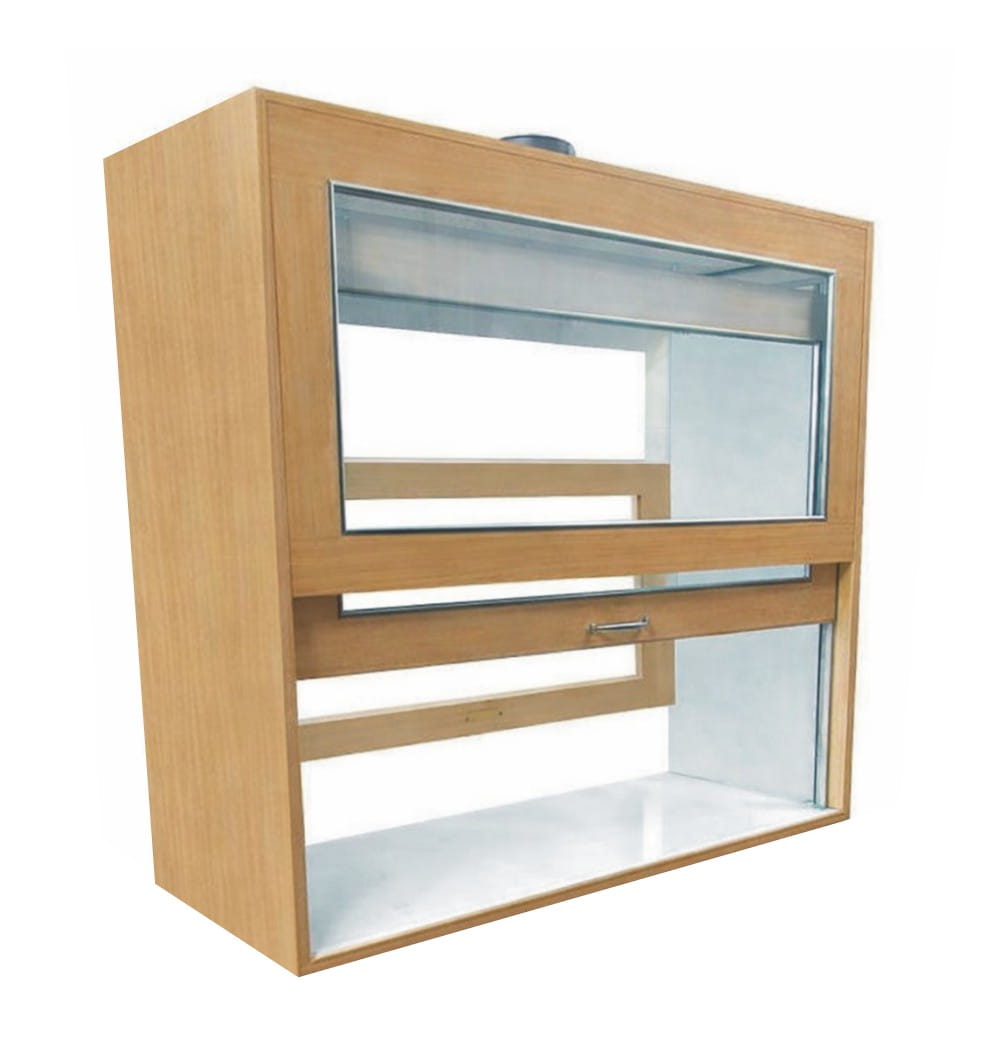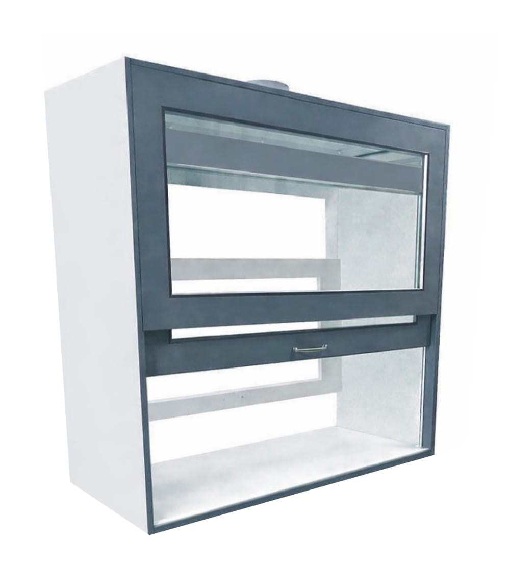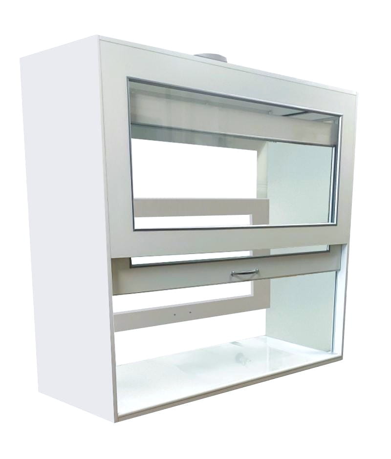 W komorze zamocowana jest przesuwana okiennica podnoszona za pomocą systemu „Fennel”. Pozwala on na ustawienie okiennicy (góra-dół) w dowolnym położeniu. Dygestorium w standardzie posiada wentylację wywiewną sufitową. Wentylator z płytą montażową stanowi wyodrębnioną część wyciągu do montażu na otworze kominowym. W standardzie wentylator kanałowy dwubiegowy o mocy 350-500m3//h. Króciec wylotowy wentylacji fi 150mm. Instalacja wyciągowa wykonana jest z polistyrenu w wersji podstawowej. Całość na nośniku laminatu. Dygestorium nastołowe jest dostępne w trzech kolorach: biały, buk, popiel.