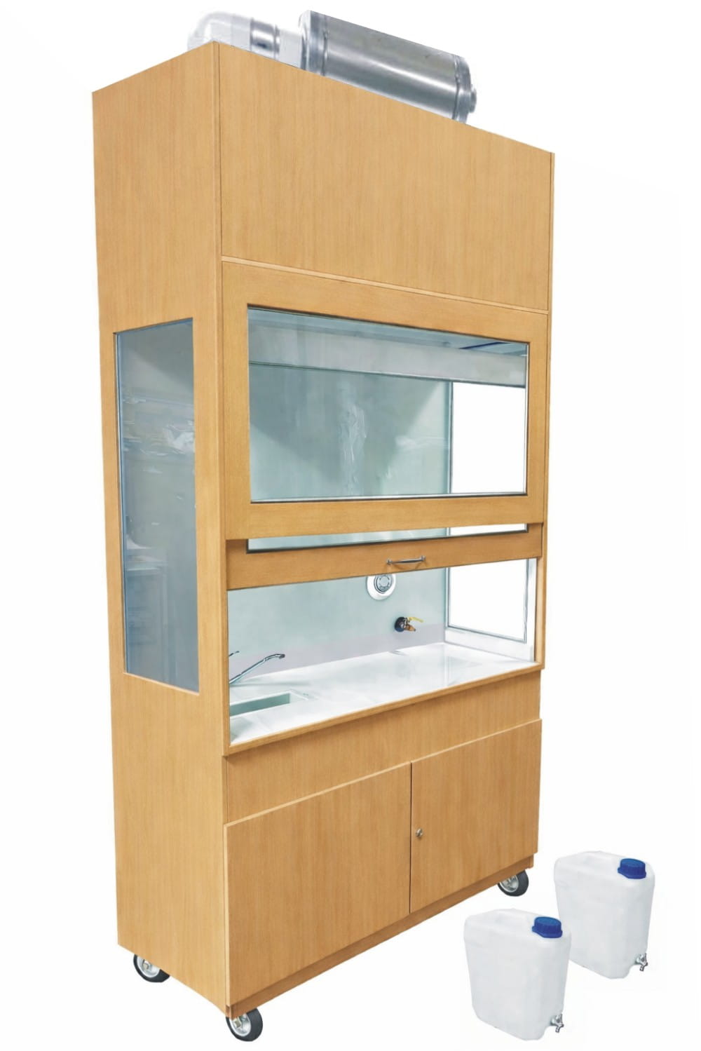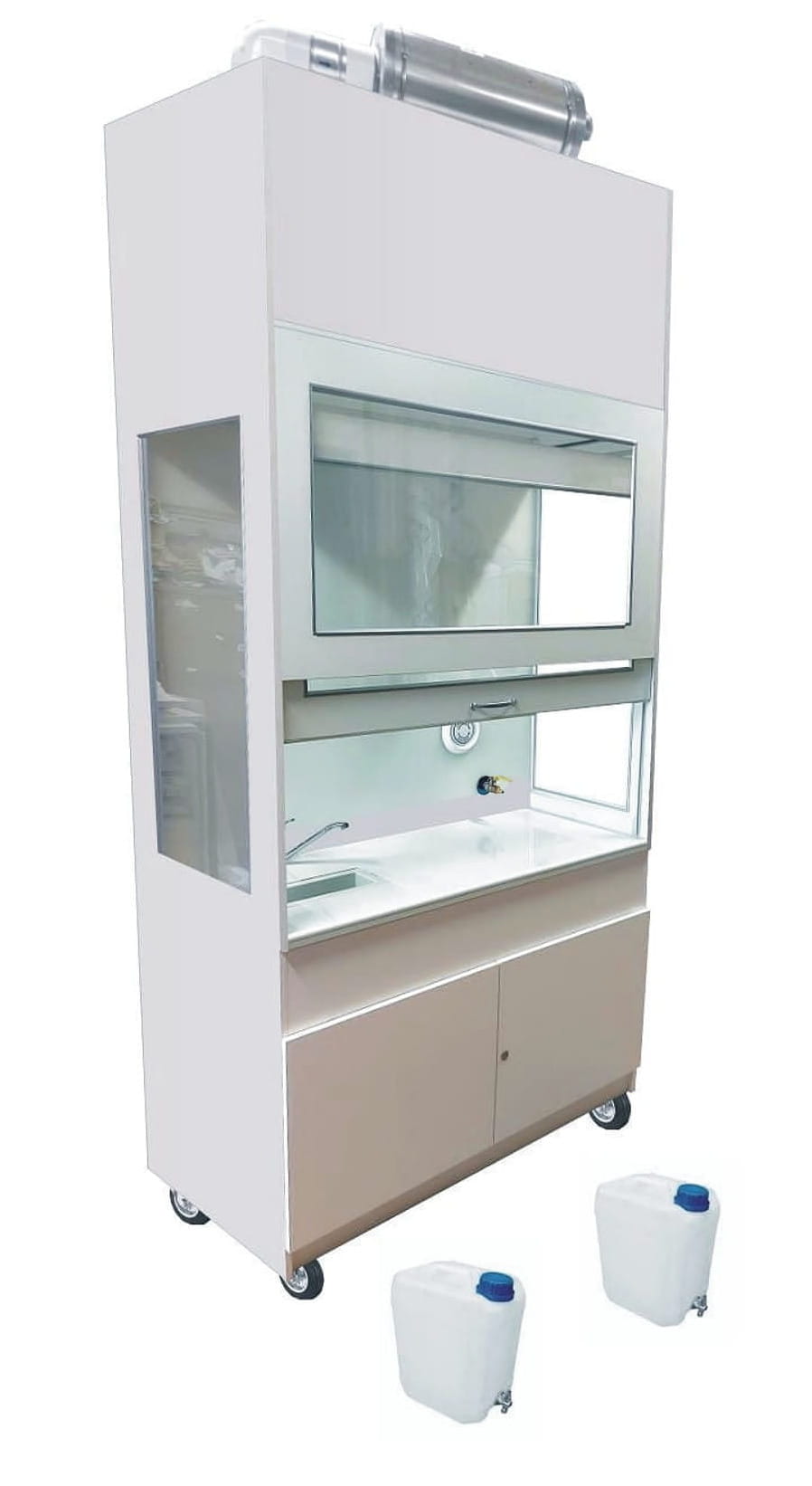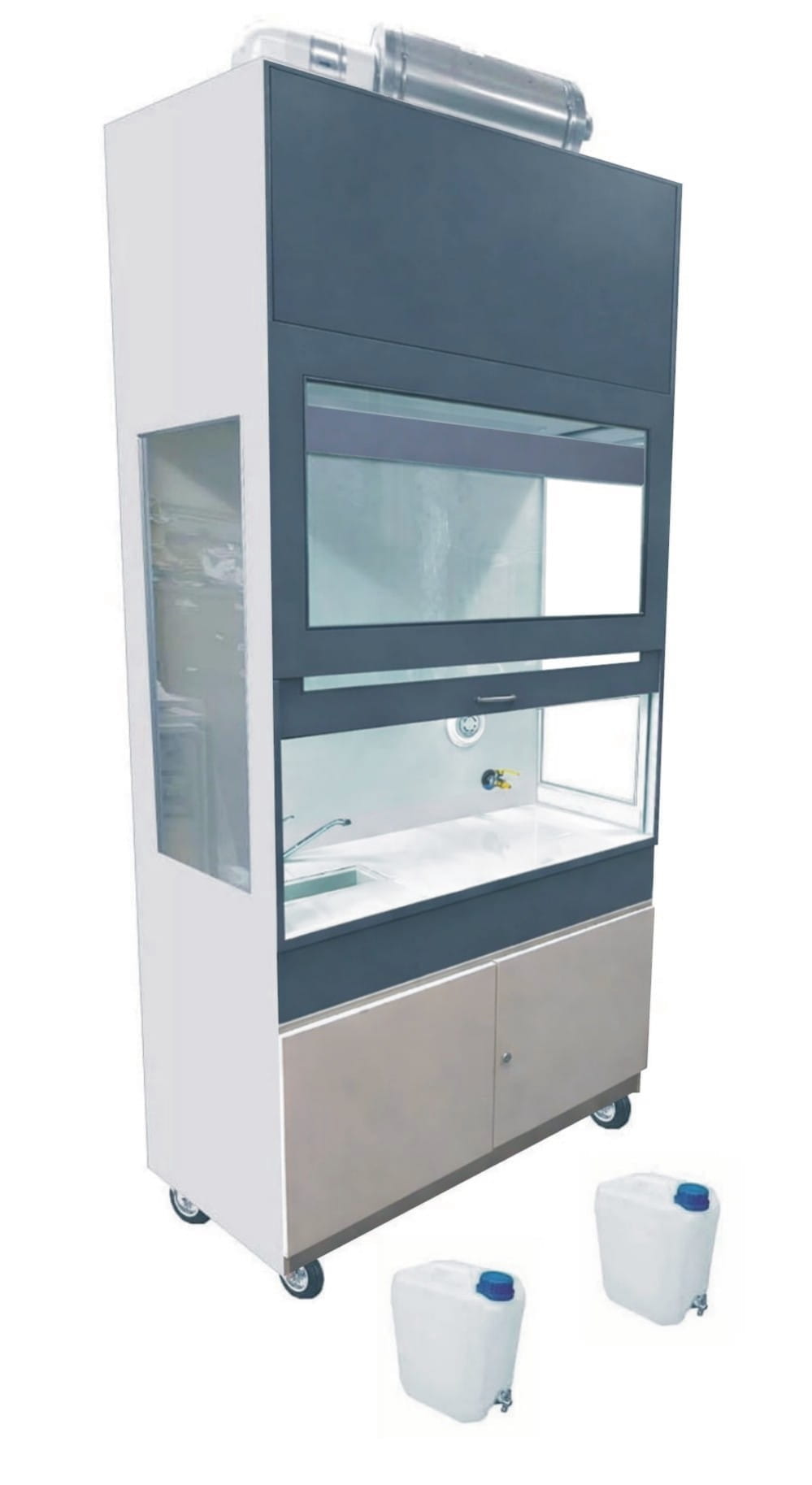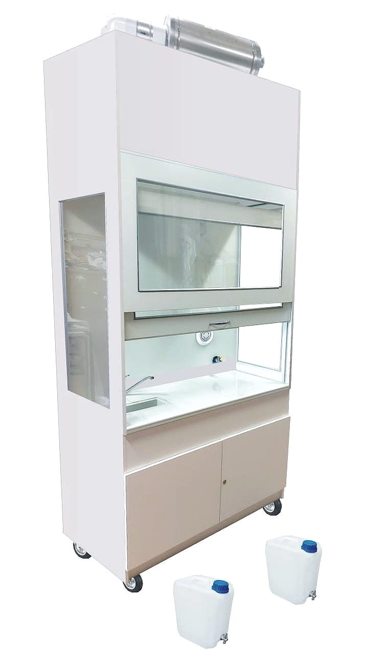 -górnej: komory manipulacyjnej oszklonej szybami hartowanymi, wyłożonej płytą polipropylenową odporną na kwasy i zasady do wysokości sufitu. Komora wyposażona jest w zlew polipropylenowy, baterię wodną, zawór gazowy, blat wykonany w standardzie z litej ceramiki technicznej, wyciąg z filtrem wstępnym węgla aktywnego, sterowany zdalnie za pomocą pilota o wydajności 300-800m3/h, filtr węglowy walcowy końcowy, filtr mechaniczny końcowy. Wyciąg wyposażony jest w potrójny system filtracji powietrza. W dygestorium mobilnym wentylator jest zintegrowany i wbudowany w górną nadstawkę.