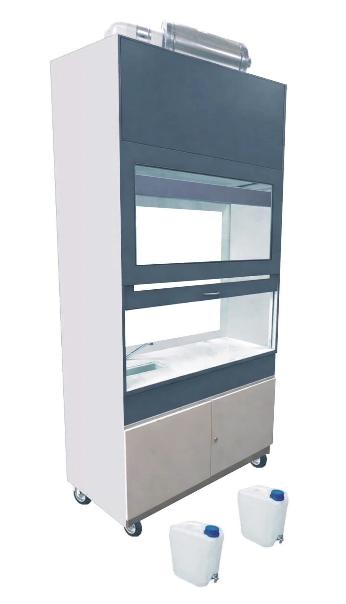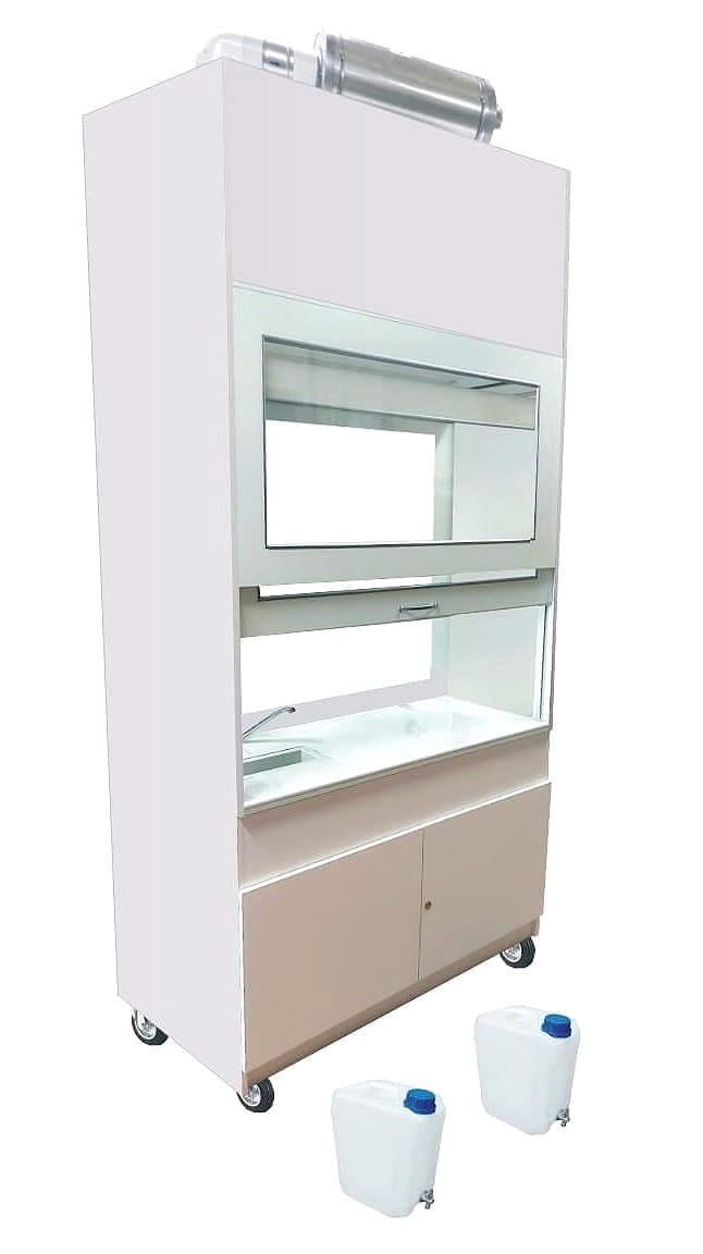 -dolnej: szafki dwudrzwiowej z zamontowanym syfonem, dygestorium posiada w wyposażeniu dwa zbiorniki na wodę (czystą i ścieki), 20l każdy, pompę wodną 24V, baterię z włącznikiem pompy wodnej.