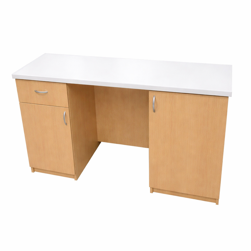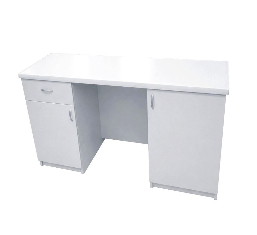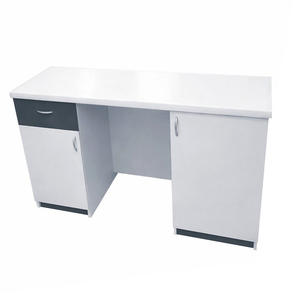 Stolik laboratoryjny podwójny wykonany na konstrukcji płyty laminowanej 18mm, wyposażony w blat pokryty litą ceramiką techniczną, szufladę, dwoje drzwiczek. Stolik dostępny w kolorach biały, popiel, buk, modern. Dodatkowe kolory na specjalne zamówienie. Wolna przestrzeń między szafkami 600 mm