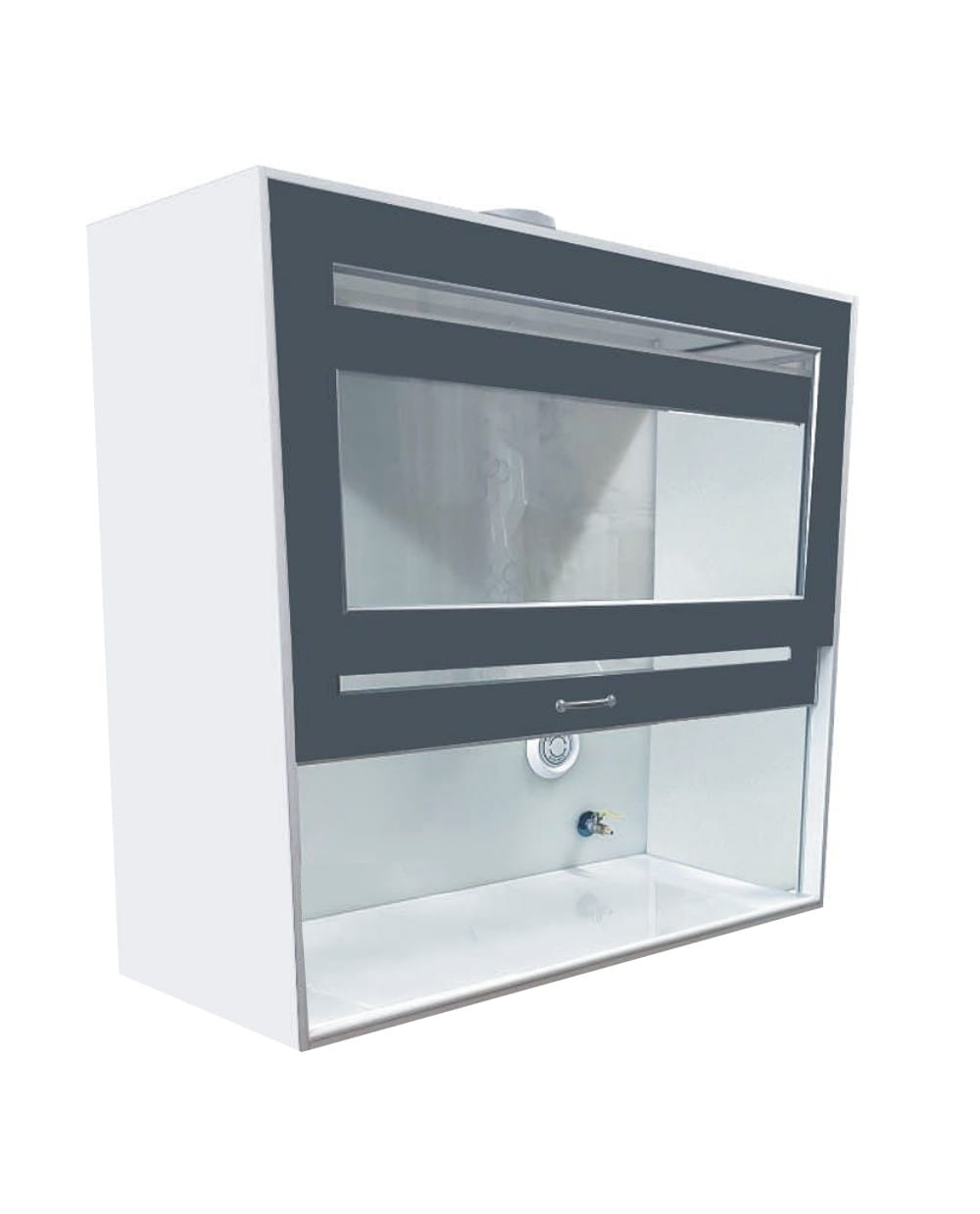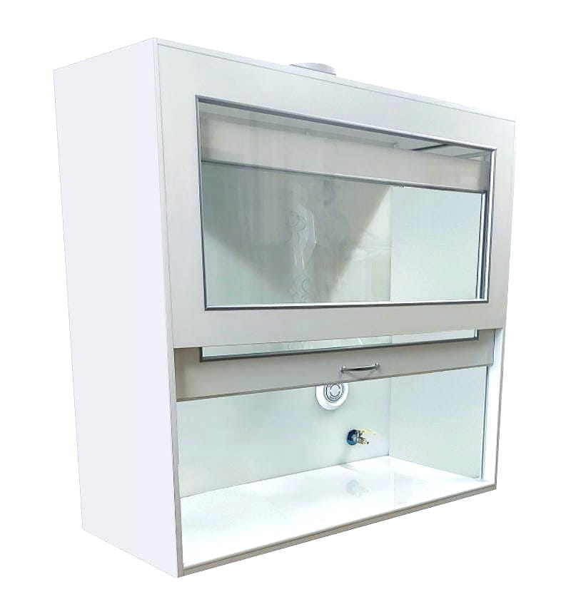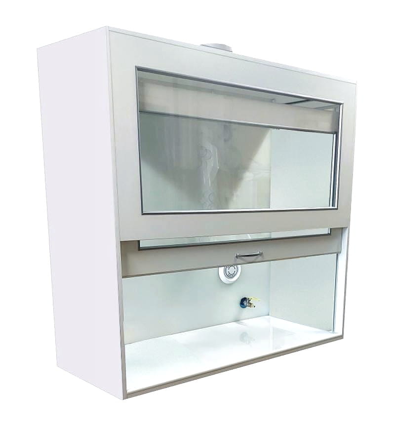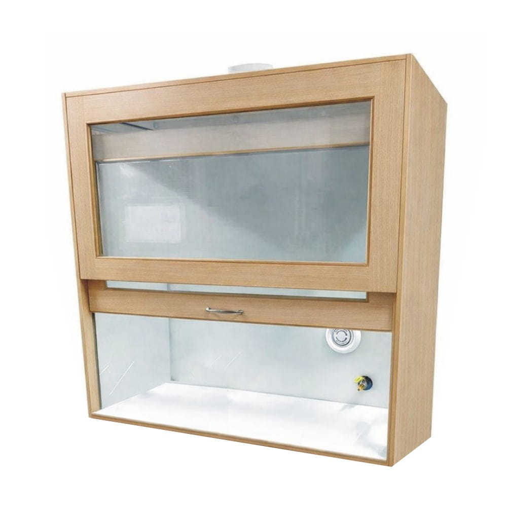 W komorze zamocowana jest przesuwana okiennica podnoszona za pomocą systemu „Fennel”. Pozwala on na ustawienie okiennicy (góra-dół) w dowolnym położeniu. Dygestorium w standardzie posiada wentylację wywiewną sufitową. Wentylator z płytą montażową stanowi wyodrębnioną część wyciągu do montażu na otworze kominowym. W standardzie wentylator kanałowy dwubiegowy o mocy 350-500m3//h. Króciec wylotowy wentylacji fi 150mm. Instalacja wyciągowa wykonana jest z polistyrenu w wersji podstawowej. Całość na nośniku laminatu. Dygestorium nastołowe jest dostępne w trzech kolorach: biały, buk, popiel.