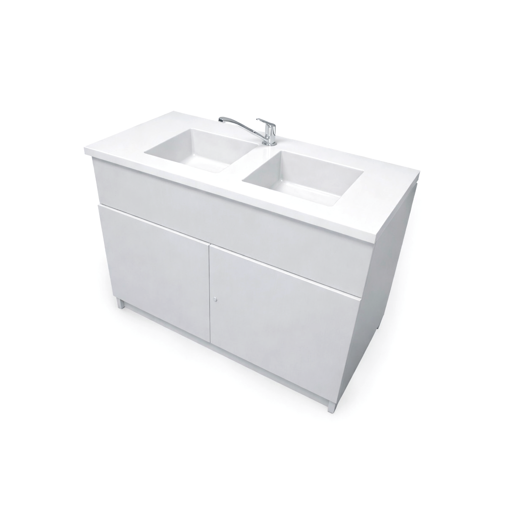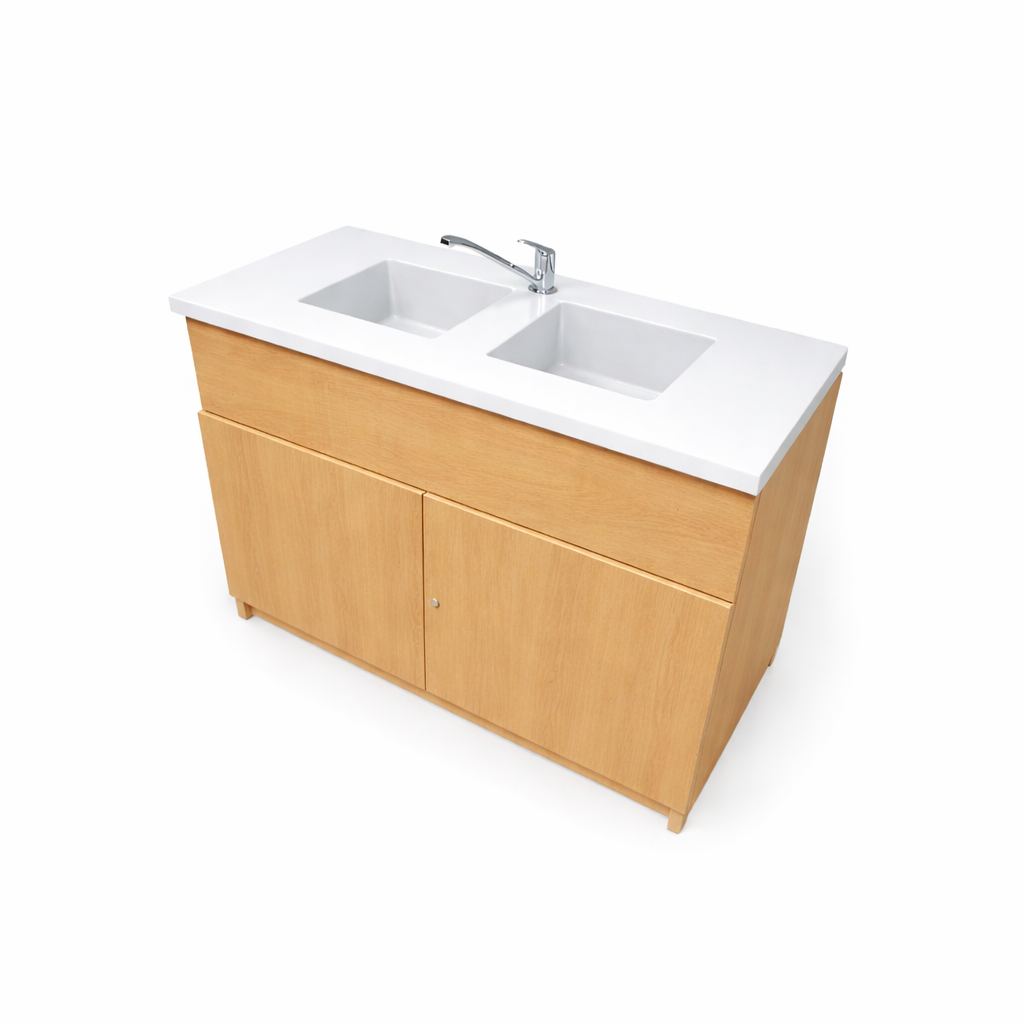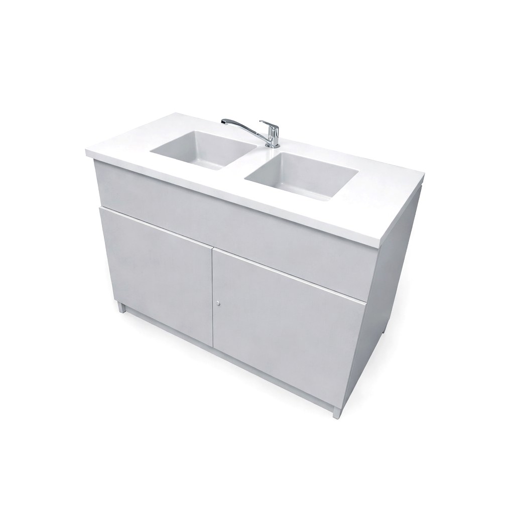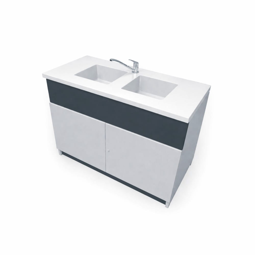 Stolik laboratoryjny dwukomorowy maxi wykonany jest na konstrukcji płyty laminowanej 18mm, wyposażony w blat pokryty litą ceramiką techniczną, dwa duże zlewy, zawór wodny, szafkę dolną zamykaną na klucz. Stolik dostępny w kolorach biały, popiel, buk, modern. Dodatkowe kolory na specjalne zamówienie.