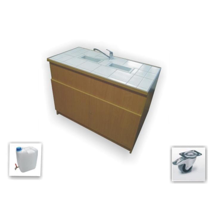 Stolik laboratoryjny mobilny dwukomorowy mini wykonany na konstrukcji płyty laminowanej 18mm, wyposażony w blat pokryty litą ceramiką techniczną, dwa małe zlewy, zawór wodny, 2 drzwiczek. Stolik dostępny w kolorach biały, popiel, buk. Dodatkowe kolory na specjalne zamówienie. Stolik posiada w wyposażeniu dwa zbiorniki na wodę czystą i ścieki 20l każdy, pompę wodną 24V, włącznik pompy na panelu zewnętrznym stolika, gniazdko elektryczne, kółka obrotowe z hamulcem.