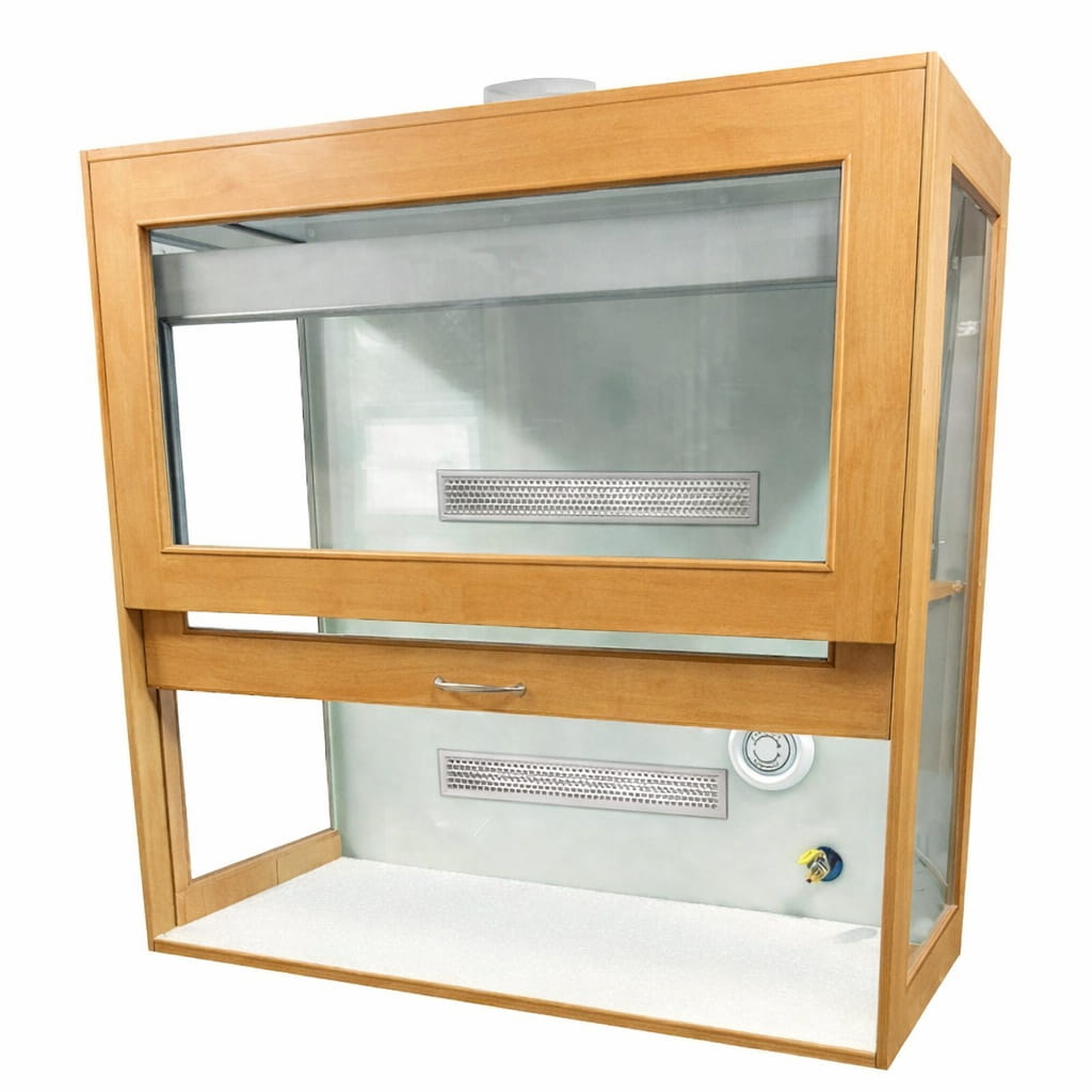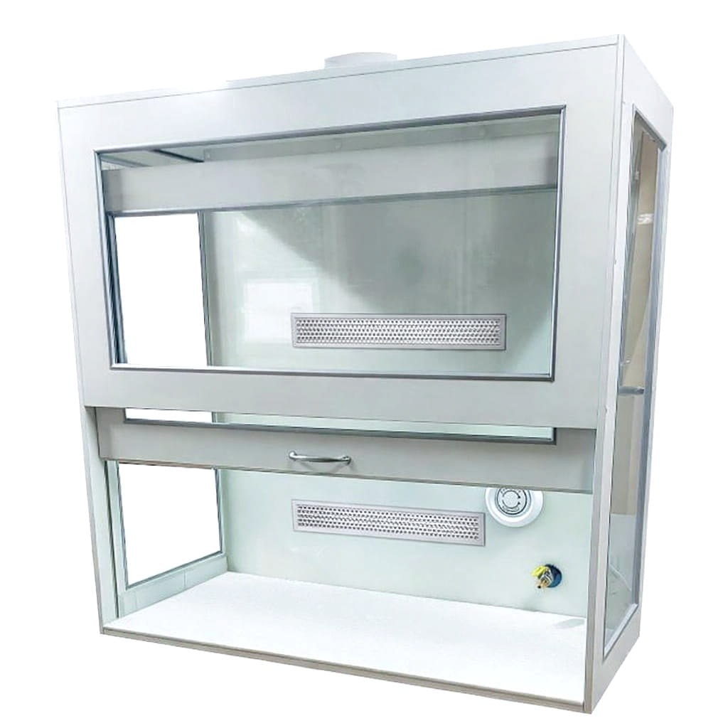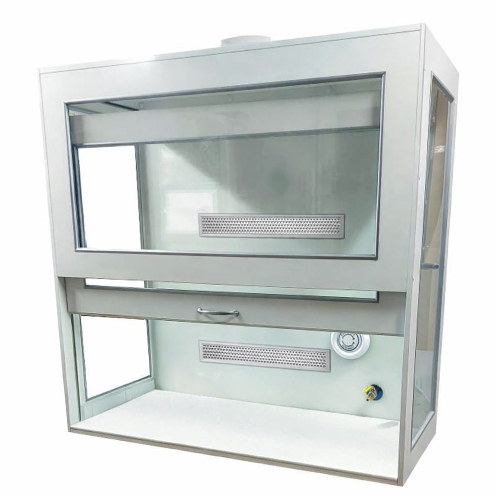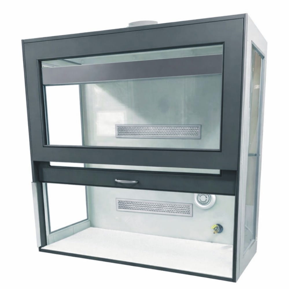 W komorze zamocowana jest przesuwana okiennica podnoszona za pomocą systemu „Fennel”. Pozwala on na ustawienie okiennicy (góra-dół) w dowolnym położeniu. Dygestorium w standardzie posiada wentylację wywiewną sufitową. Wentylator z płytą montażową stanowi wyodrębnioną część wyciągu do montażu na otworze kominowym. W standardzie wentylator kanałowy dwubiegowy o mocy 350-500m3//h. Króciec wylotowy wentylacji fi 150mm. Instalacja wyciągowa wykonana jest z polistyrenu w wersji podstawowej. Całość na nośniku laminatu. Dygestorium nastołowe jest dostępne w trzech kolorach: biały, buk, popiel.