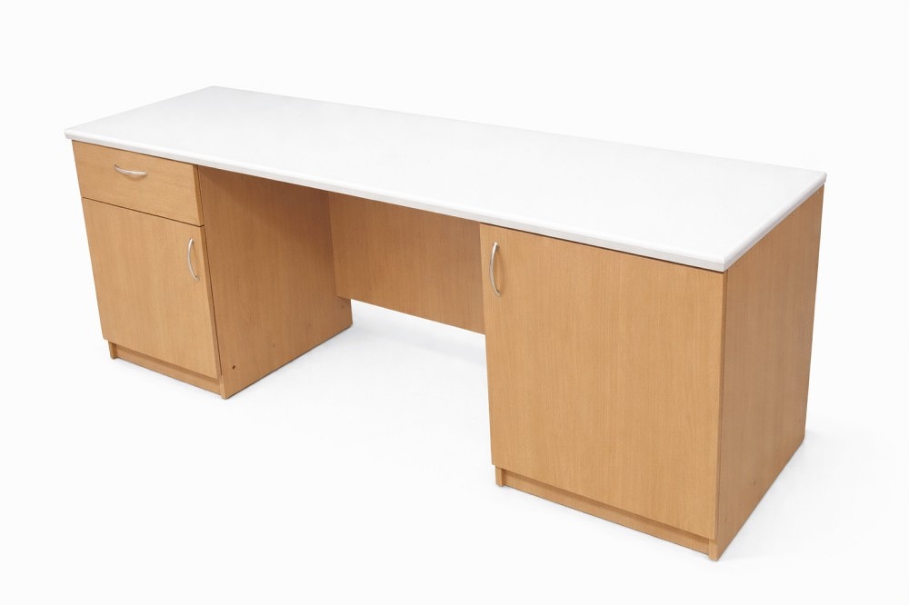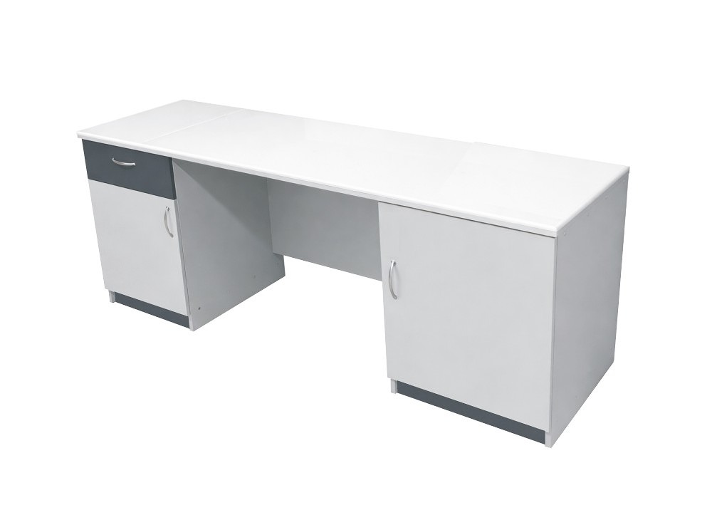 Stolik laboratoryjny podwójny 195 wykonany na konstrukcji płyty laminowanej 18mm, wyposażony w blat pokryty litą ceramiką techniczną, szufladę, dwoje drzwiczek. Stolik dostępny w kolorach biały, popiel, buk, modern. Dodatkowe kolory na specjalne zamówienie. Wolna przestrzeń między szafkami : 800 mm