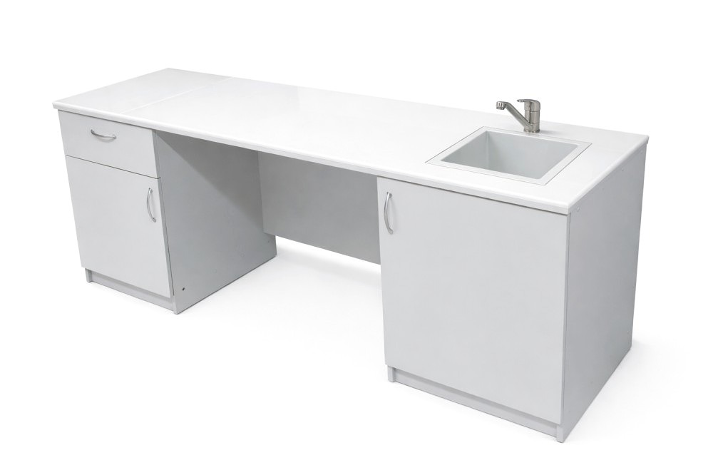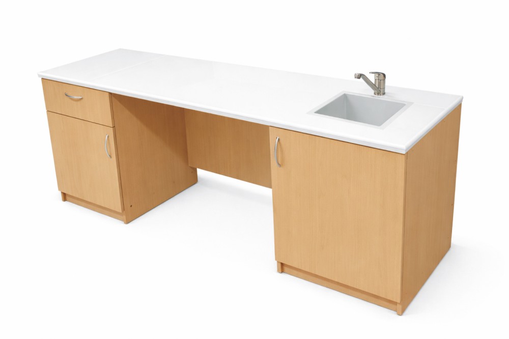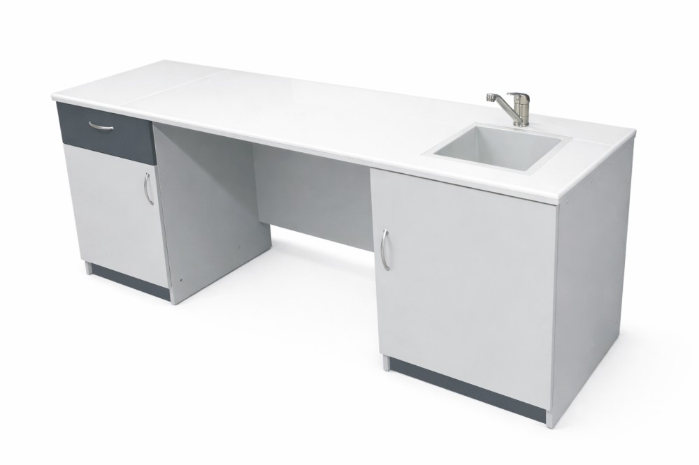 Stolik laboratoryjny podwójny jednokomorowy maksi 195 wykonany na konstrukcji płyty laminowanej 18mm, wyposażony w blat pokryty litą ceramiką techniczną, szufladę, dwoje drzwiczek, jeden duży zlew polipropylenowy. Stolik dostępny w kolorach biały, popiel, buk, modern. Dodatkowe kolory na specjalne zamówienie. Wolna przestrzeń między szafkami : 800 mm