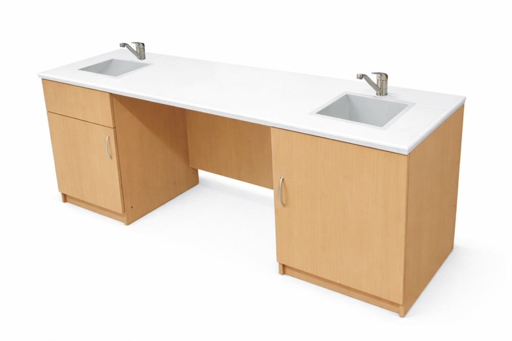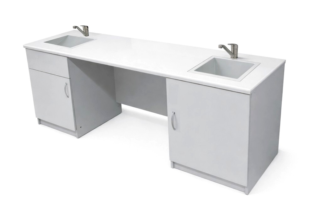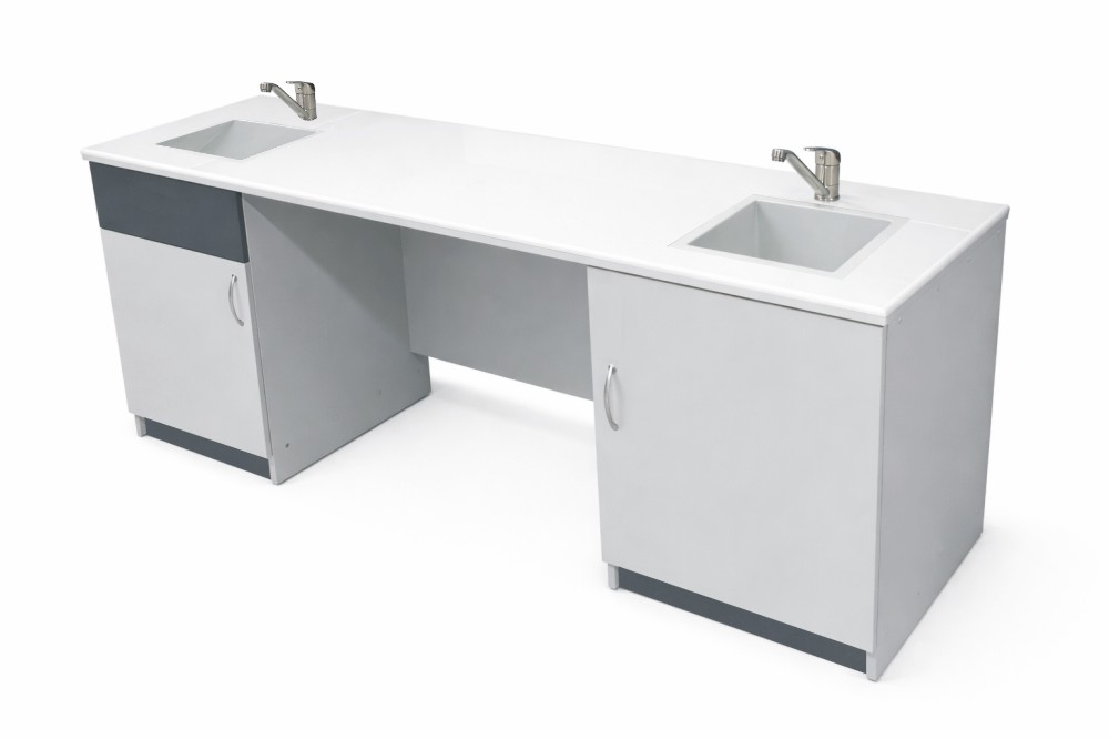 Stolik laboratoryjny podwójny dwukomorowy maksi 195 wykonany na konstrukcji płyty laminowanej 18mm, wyposażony w blat pokryty litą ceramiką techniczną, szufladę, dwoje drzwiczek, dwa duże zlewy polipropylenowe 30x30 cm. Stolik dostępny w kolorach biały, popiel, buk, modern. Dodatkowe kolory na specjalne zamówienie. Wolna przestrzeń między szafkami : 800 mm