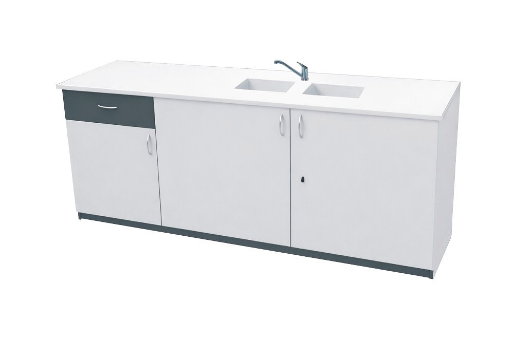 Stolik laboratoryjny wykonany na konstrukcji płyty laminowanej 18mm, wyposażony w blat pokryty litą ceramiką techniczną, szufladę, drzwiczki, szafkę, dwa zlewy polipropylenowy małe 15x30 cm. Stolik dostępny w kolorach biały, popiel, buk, modern. Dodatkowe kolory na specjalne zamówienie. Wolna przestrzeń między szafkami : 800 mm