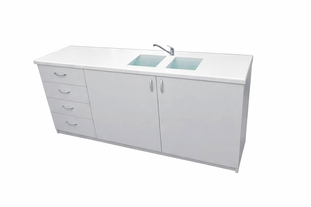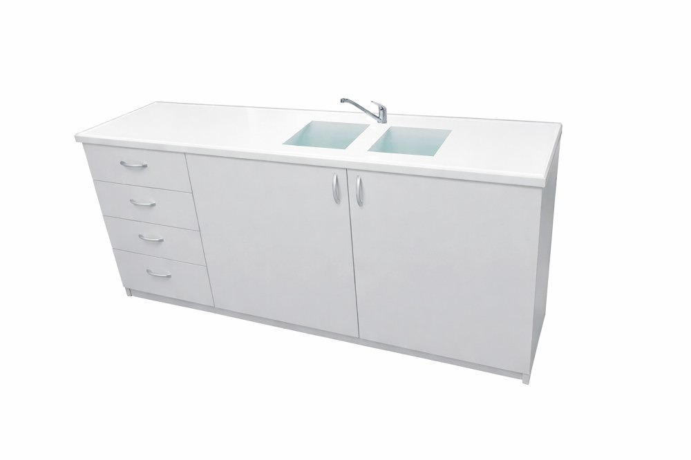 Stolik laboratoryjny pełny szufladowy dwukomorowy maksi 195 wykonany na konstrukcji płyty laminowanej 18mm, wyposażony w blat pokryty litą ceramiką techniczną, cztery szuflady, szafkę, dwa zlewy polipropylenowe duże 30x30 cm. Stolik dostępny w kolorach biały, popiel, buk, modern. Dodatkowe kolory na specjalne zamówienie. Wolna przestrzeń między szafkami : 800 mm