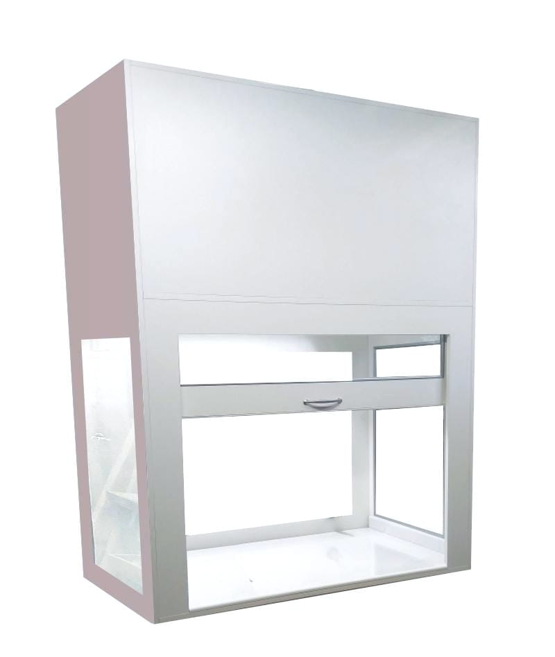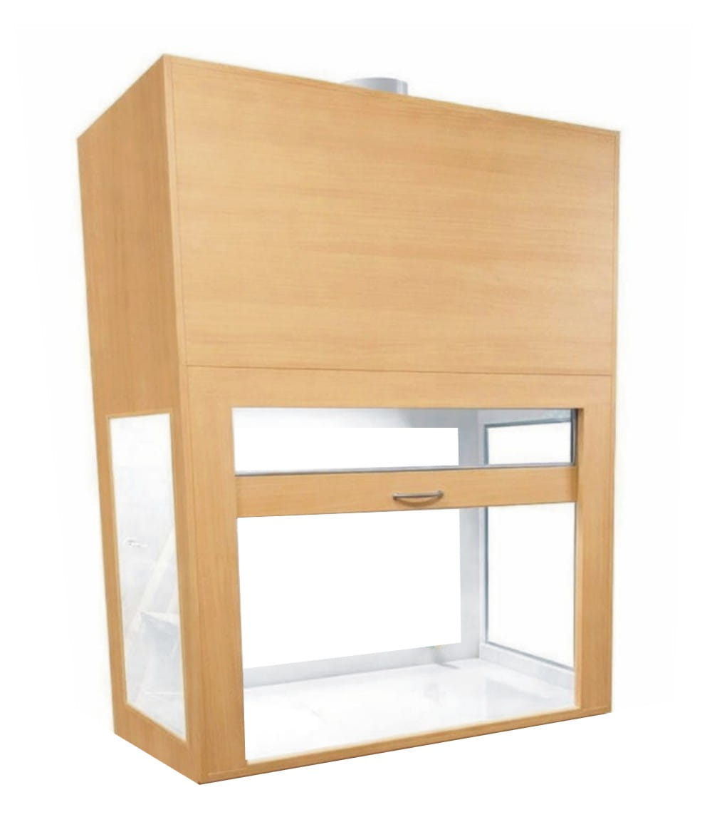 W komorze zamocowana jest przesuwana okiennica podnoszona za pomocą systemu „Fennel”. Pozwala on na ustawienie okiennicy (góra-dół) w dowolnym położeniu. Dygestorium w standardzie posiada wentylację wywiewną sufitową. Wentylator z płytą montażową stanowi wyodrębnioną część wyciągu do montażu na otworze kominowym. W standardzie wentylator kanałowy dwubiegowy o mocy 350-500m3//h. Króciec wylotowy wentylacji fi 150mm. Instalacja wyciągowa wykonana jest z polistyrenu w wersji podstawowej. Całość na nośniku laminatu. Dygestorium nastołowe jest dostępne w trzech kolorach: biały, buk, popiel.