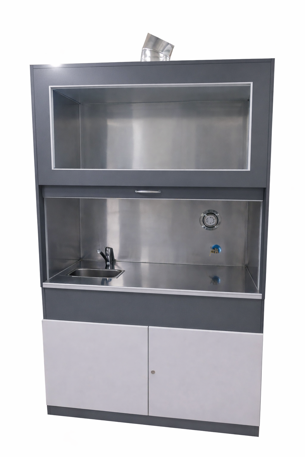 Dygestorium Pro-I-stal nierdzewna jest to dygestorium, w którym użyliśmy do produkcji możliwie najwięcej elementów wykonanych z blachy kwasoodpornej. Sam stelaż wykonany jest z płyty laminowanej 18 mm, natomiast wszystkie pozostałe elementy są wykonane z blachy kwasoodpornej. Blat, ściana tylna i boki wykonane są z blachy kwasoodpornej połysk, wentylator z blachy kwasoodpornej 600 m3/h z natynkowym wyłącznikiem oraz płynną możliwością regulacji prędkości obrotowej, zlew i bateria wykonane z blachy kwasoodpornej, kształtki wentylacyjne również wykonane z blachy kwasoodpornej.
