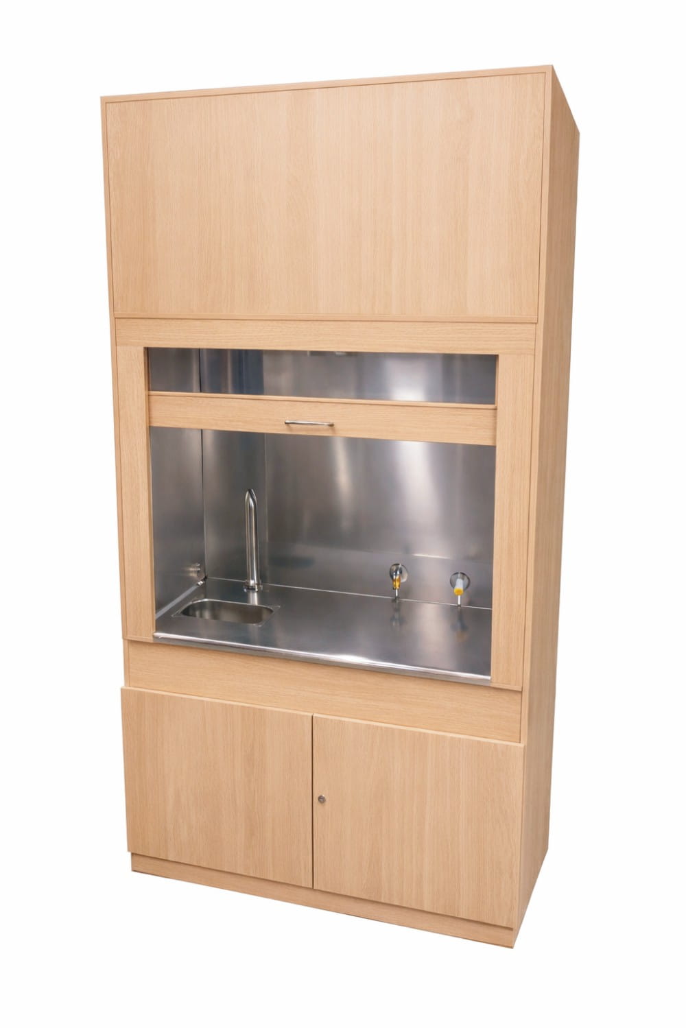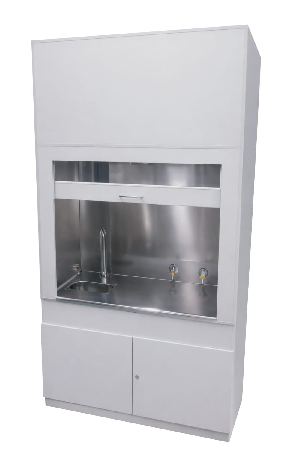 Dygestorium Pro-V typ A -stal nierdzewna jest to urządzenie, w którym użyliśmy do produkcji możliwie najwięcej elementów wykonanych z blachy kwasoodpornej. Sam stelaż wykonany jest z płyty laminowanej 18 mm, natomiast wszystkie pozostałe elementy są wykonane z blachy kwasoodpornej. Blat, ściana tylna i boki wykonane są z blachy kwasoodpornej połysk, wentylator z blachy kwasoodpornej 600 m3 z natynkowym wyłącznikiem oraz płynną możliwością regulacji prędkości obrotowej, zlew i bateria wykonane z blachy kwasoodpornej, kanały wentylacyjne również wykonane z blachy kwasoodpornej. Ściana frontowa to witryna ruchoma z szybami hartowanymi.