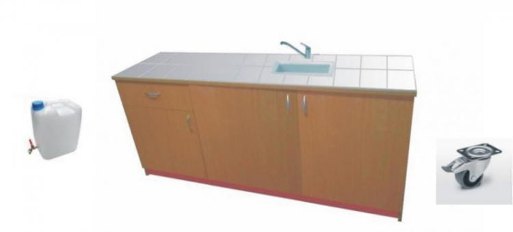 Stolik laboratoryjny pełny mobilny jednokomorowy mini 195 wykonany na konstrukcji płyty laminowanej 18mm, wyposażony w blat pokryty lita ceramiką techniczną, szufladę, 2 drzwiczek. Stolik posiada w wyposażeniu mały zlew, dwa zbiorniki na wodę czystą i ścieki 20l każdy, pompę wodną 24V, włącznik pompy na panelu zewnętrznym stolika, kółka obrotowe z hamulcem. Stolik dostępny w kolorach biały, popiel, buk. Dodatkowe kolory na specjalne zamówienie.